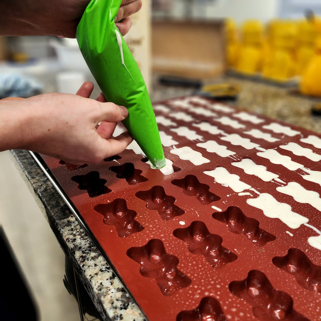 We also cater to as many food preferences as possible. Our innovative marshmallow recipe is egg-white, pork or beef gelatin-free. Our dark chocolate confectionery is made in a workshop where no animal products are used! Our gummies are organic and vegan!