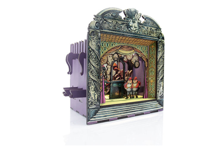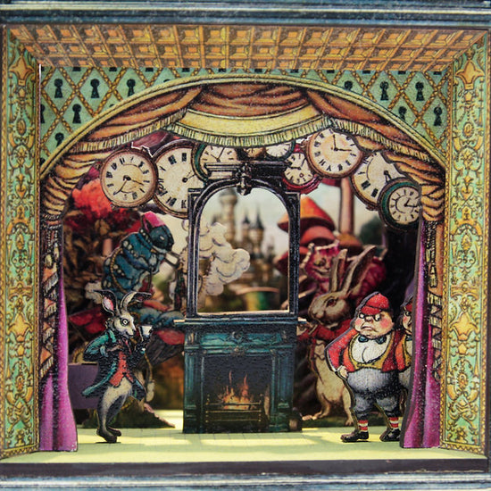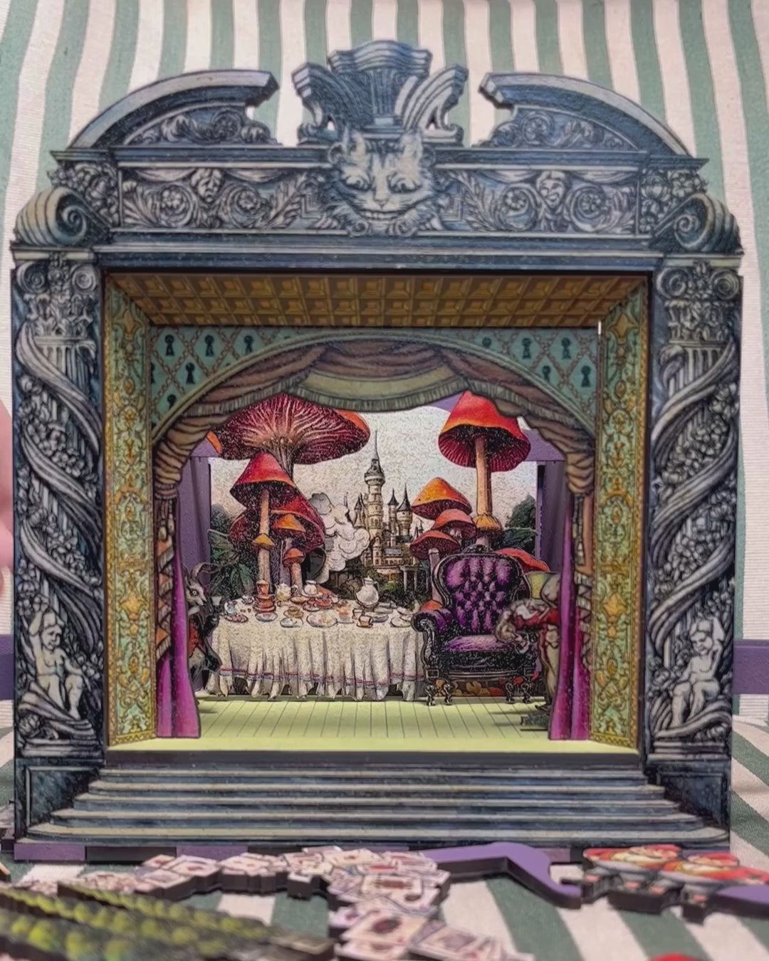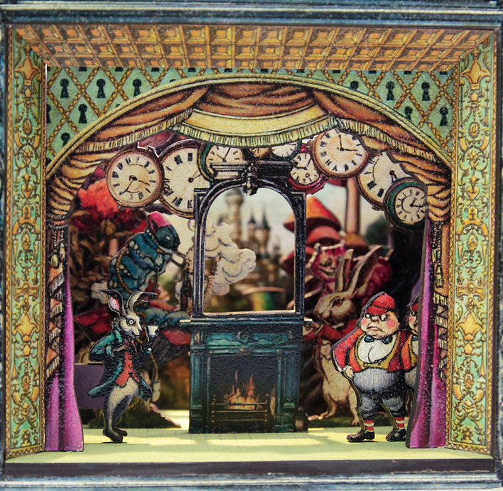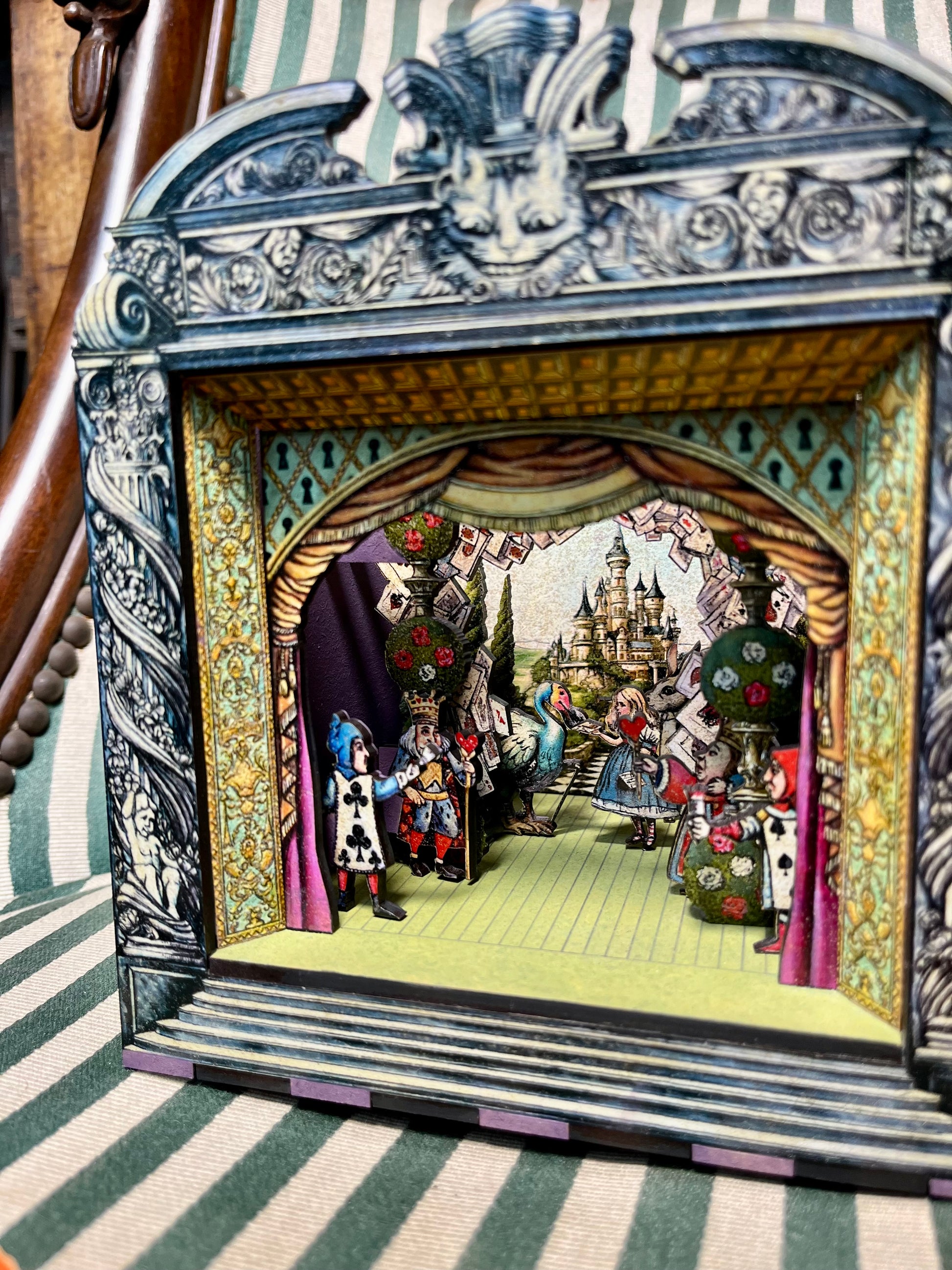 This miniature wooden paper theater brings Alice’s adventure to life as she embarks on her journey to Wonderland.