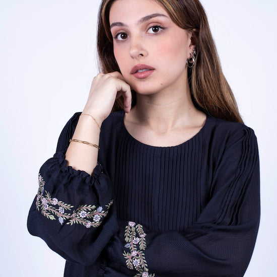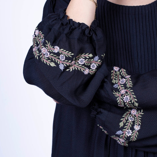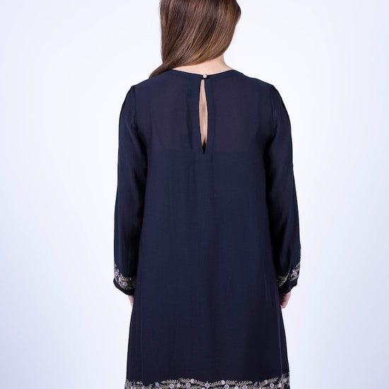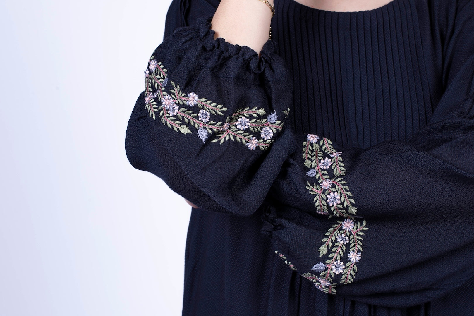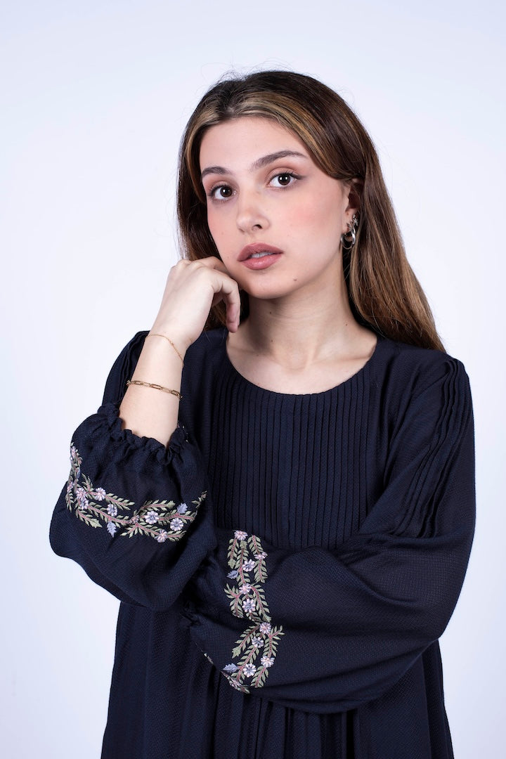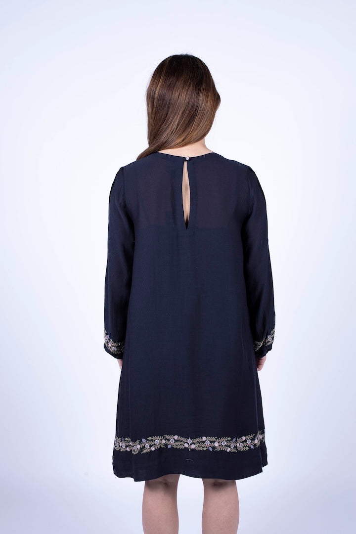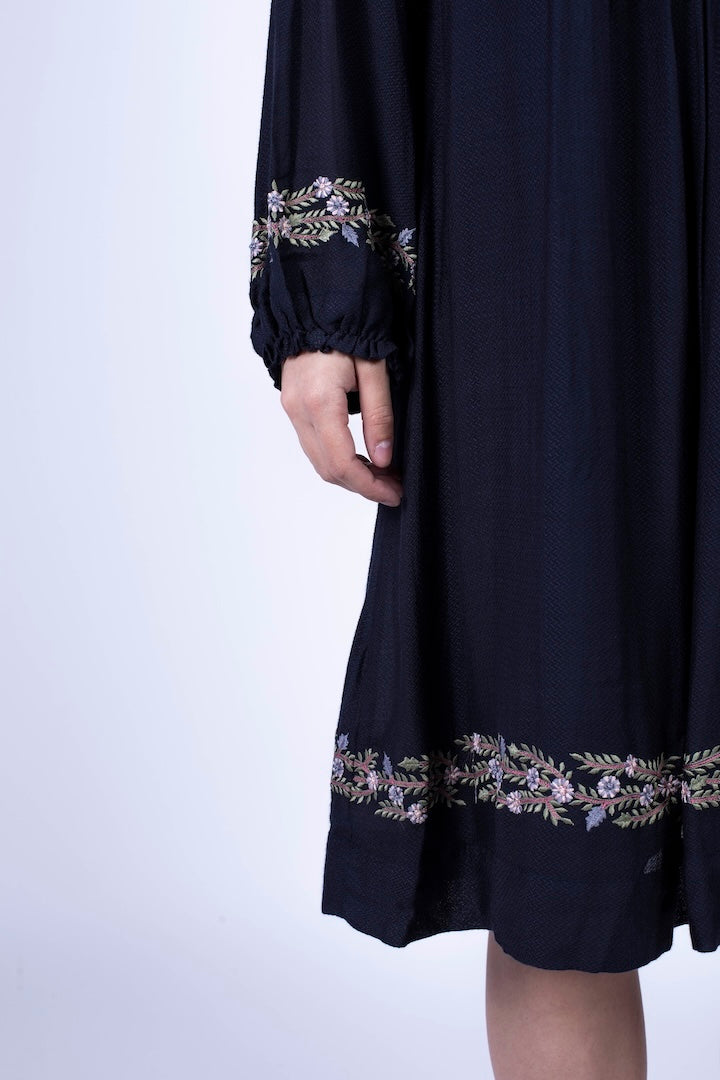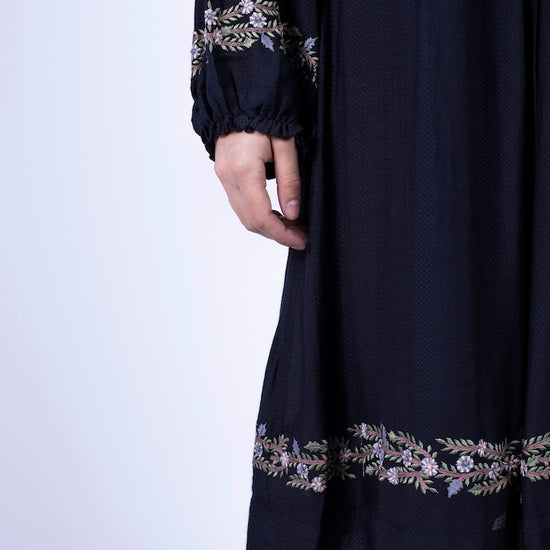 softness and sustainability. Featuring a flattering mid-length, flared silhouette, this dress is adorned with intricate hand-embroidered details. Signature LO NEEL motifs -floral designs and the majestic peacock - grace the sleeves and hem, adding a unique artistic touch.