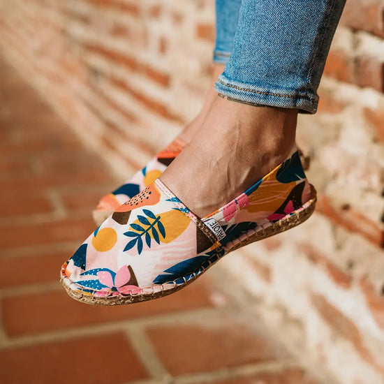 Say aloha to summer with the Audrey Tropical espadrille by Payote, a playful, breathable shoe that brings island vibes to your everyday style. Made from light cotton canvas, its vibrant print features juicy papayas and lush tropical plants in shades of pink, orange, blue, and yellow - all set against a soft pink and white background that captures the essence of a tropical escape.