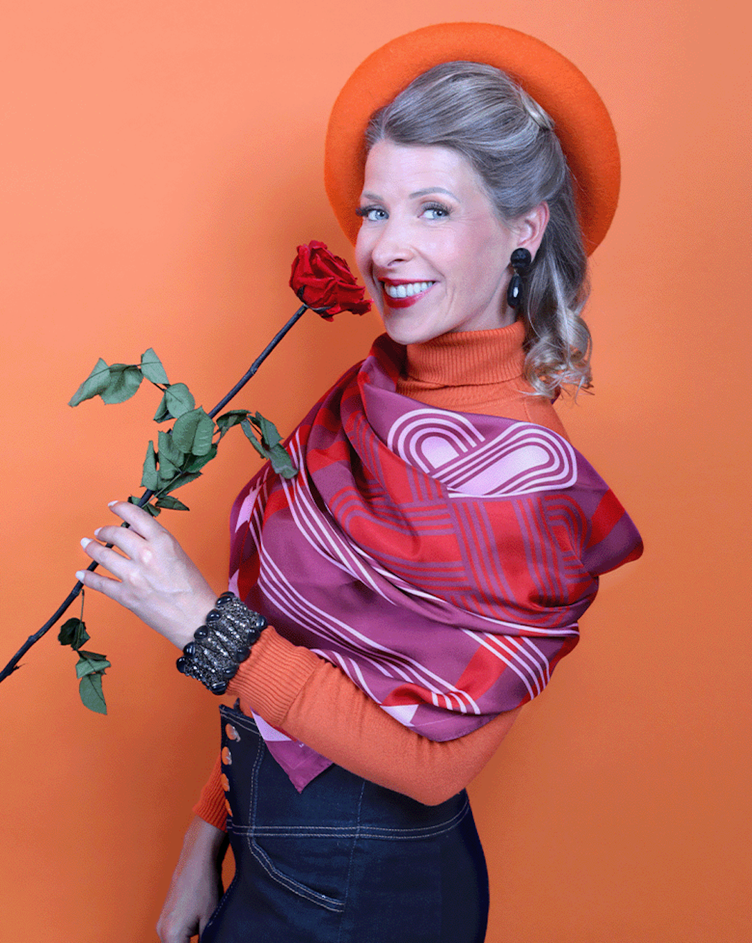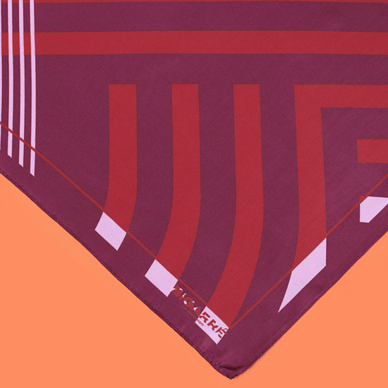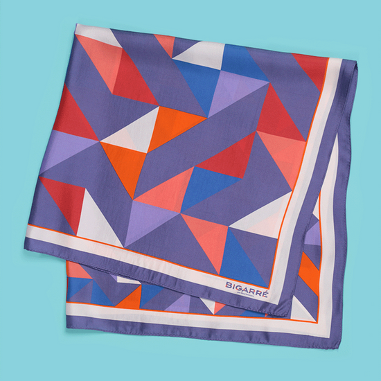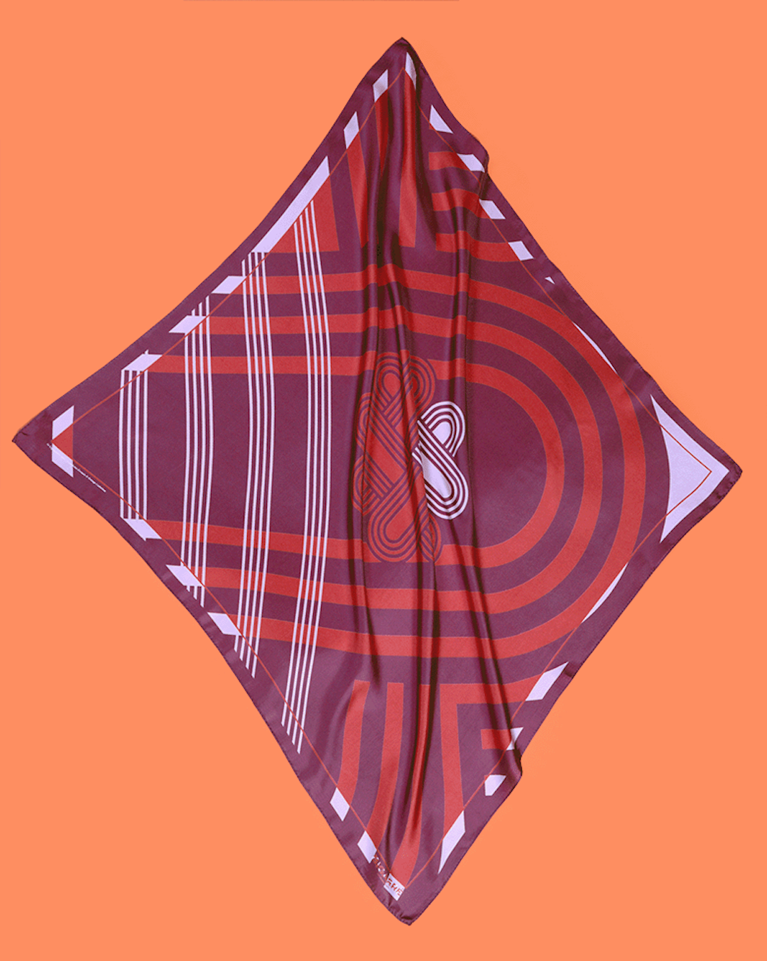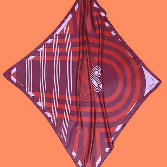 Discover the bold artistry of French silk-making with Le Légendaire Tan – Dark Purple & Cadmium Orange, a limited-edition silk square crafted and printed in Lyon, the historic heart of French silk-making. Part of the Tan series, this creation is a wearable tribute to geometric design and 1970s-inspired creativity.