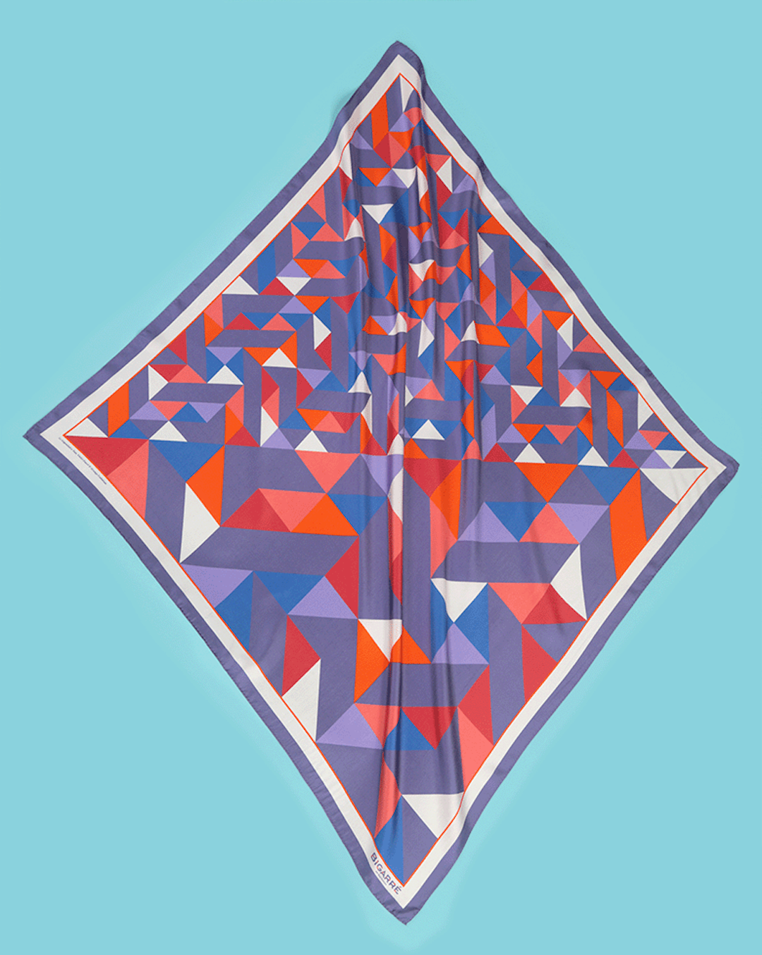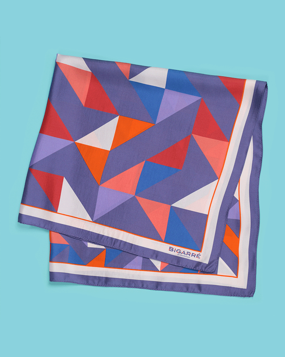 This silk print features a vibrant composition of interwoven colorful triangles, evoking a sense of movement and harmony. The Tan series draws inspiration from the bold geometric shapes and striking color contrasts of the 1970s. At its core, this design pays tribute to the Tangram, the iconic Chinese puzzle that plays with form and creativity. The result is a dynamic and visually captivating silk square that elevates any outfit.