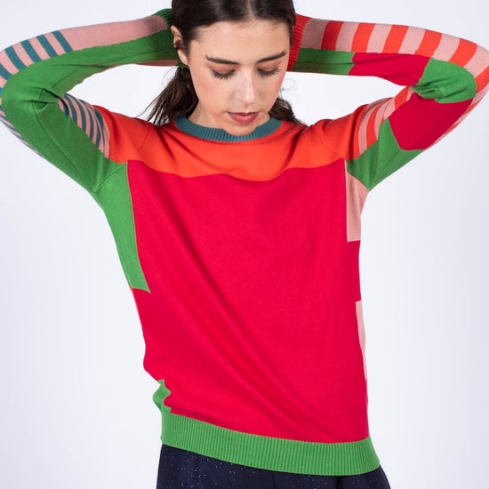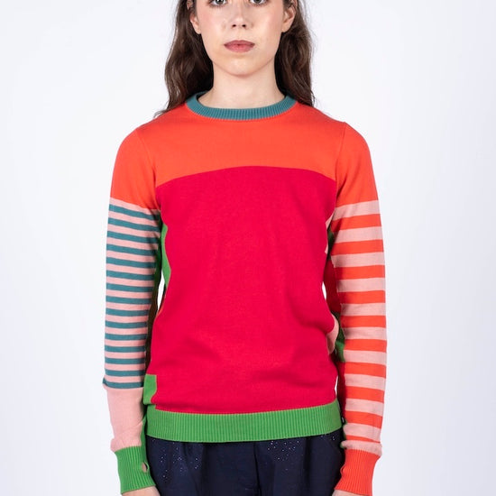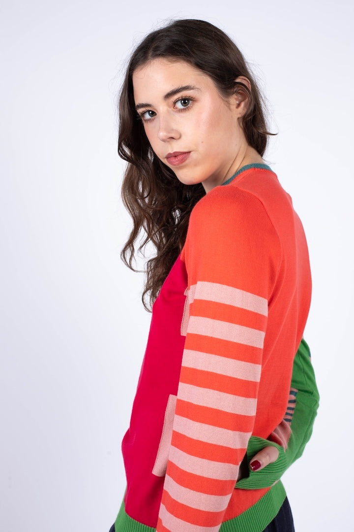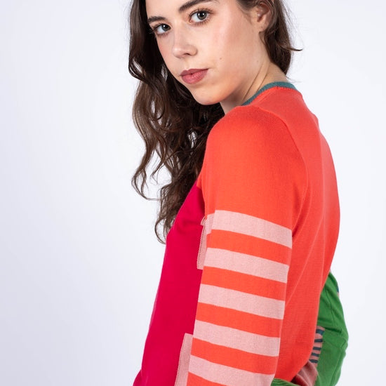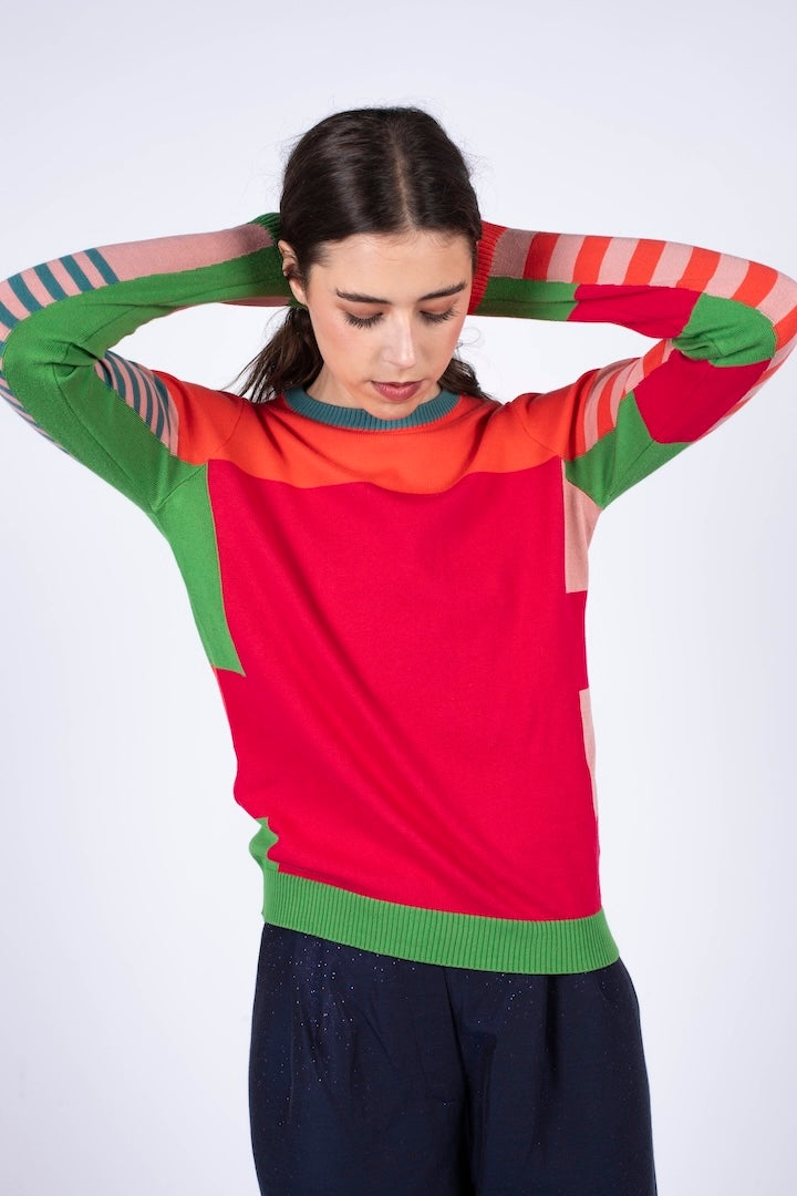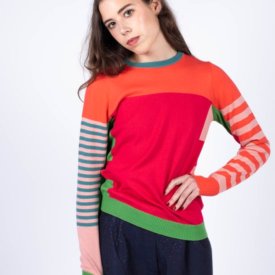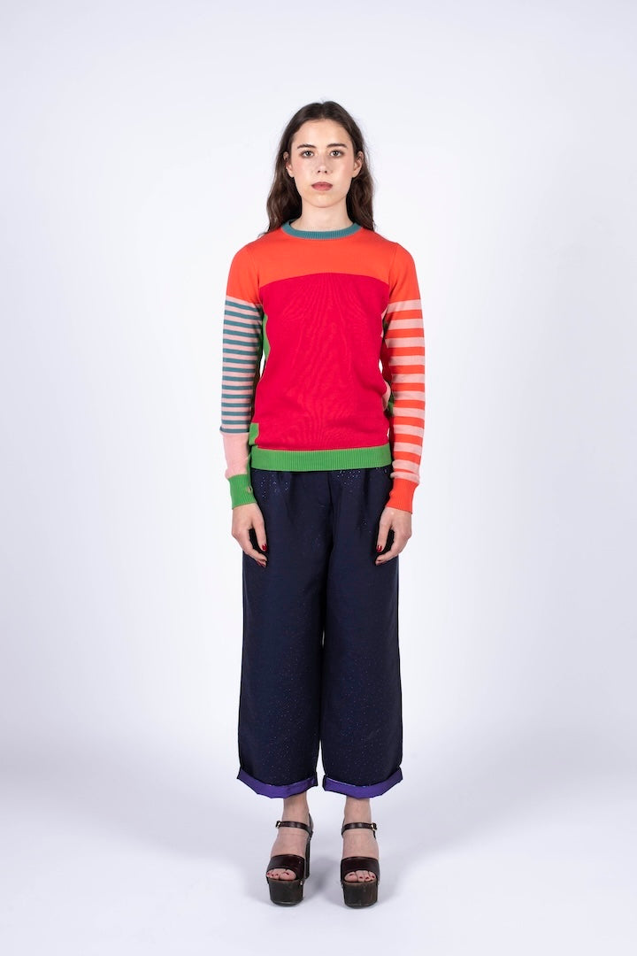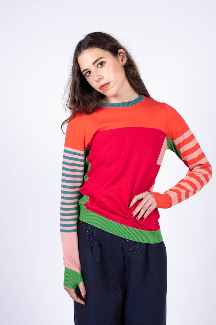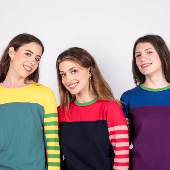 The Céline Sunset Sweater reinterprets the French marinière with a responsible and stylish twist. Its vibrant hues are proof that ethical fashion doesn't have to be traditional. Our Italian partner workshop uses 1970s automatic machines to preserve the beauty of craftsmanship.