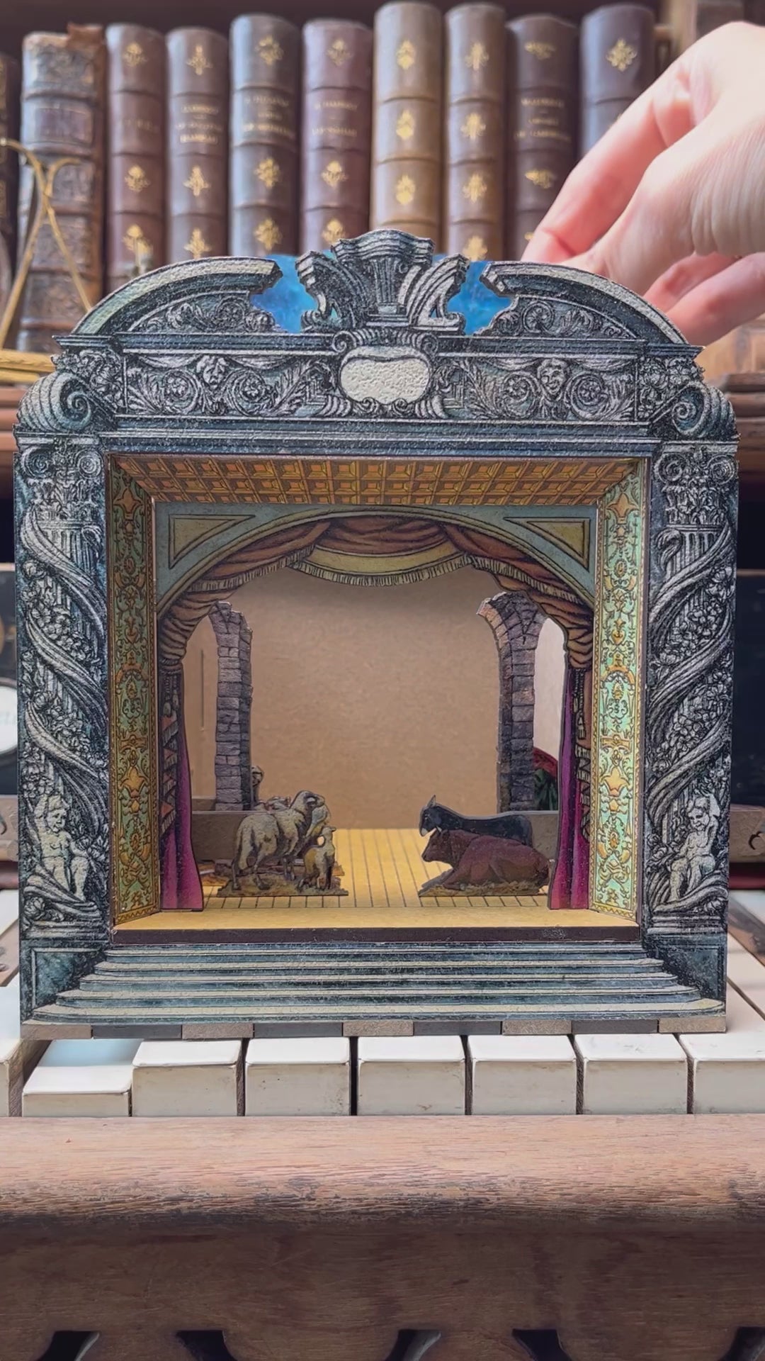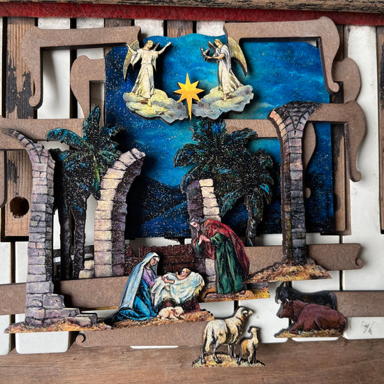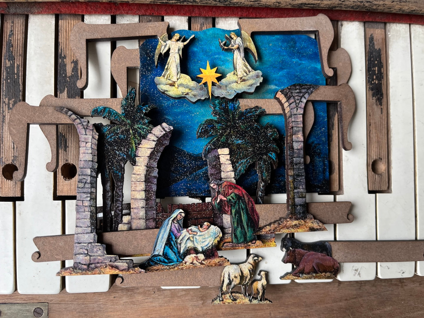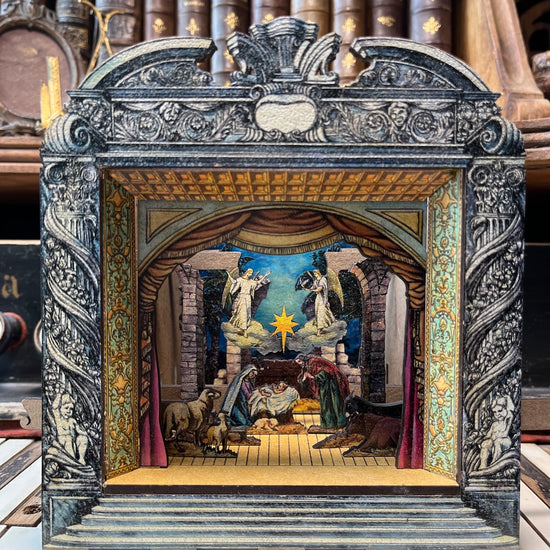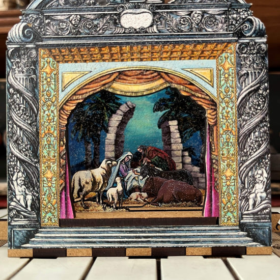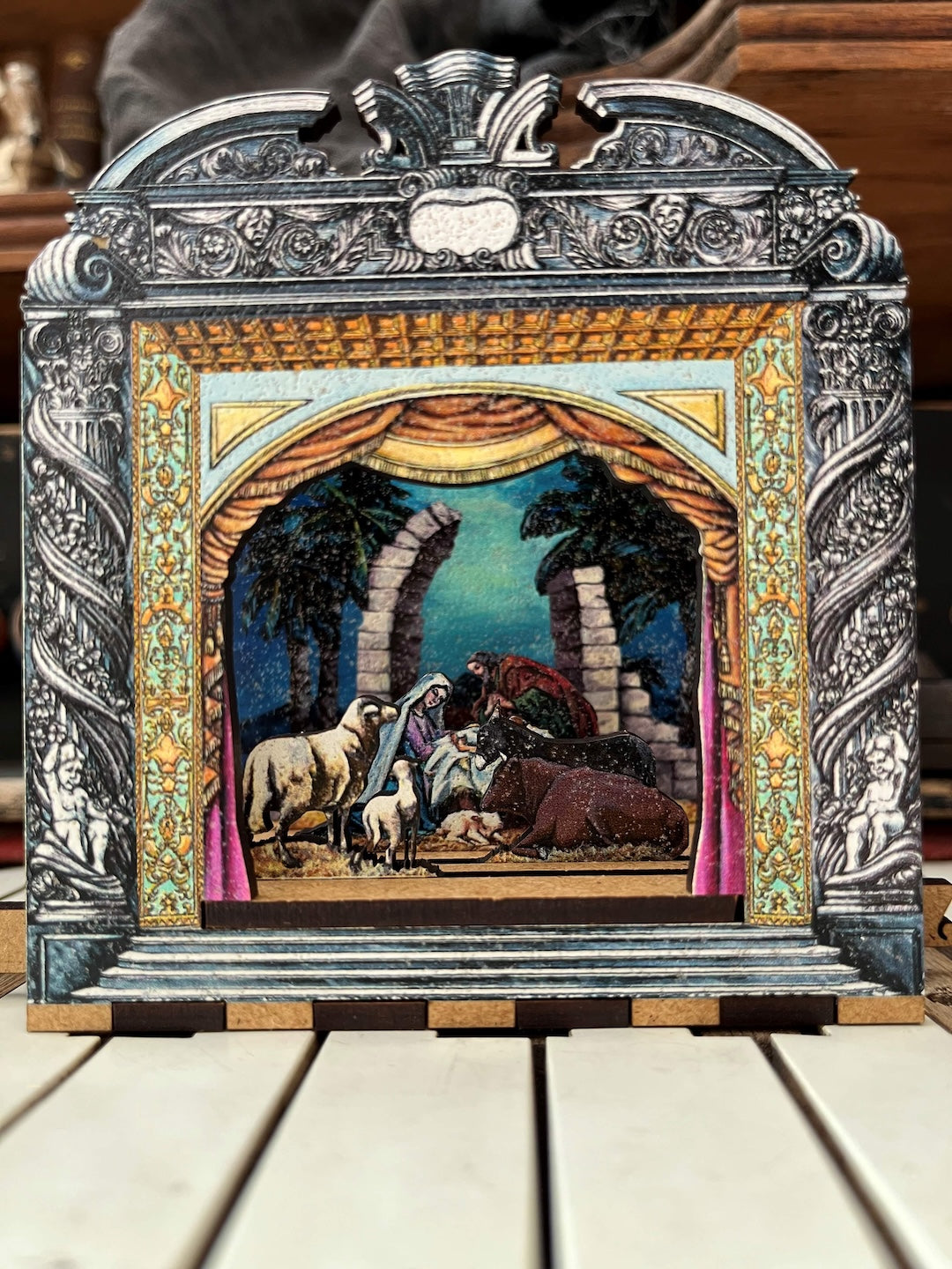 The Christmas Nativity scene comes to life in a charming miniature theatre, capturing the enchantment of the season. Delicately cut figurines depict the Holy Family, surrounded by animals and shepherds, all set within a beautifully illuminated scene glowing with warmth.