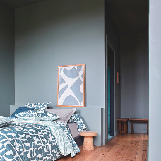 Bring contemporary geometric elegance and cozy comfort to your bedroom with the CRAFT Bleu Paon Collection.
