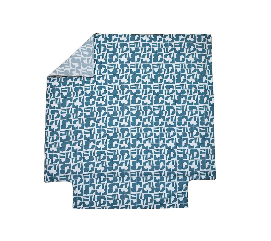 The CRAFT Bleu Paon quilt showcases small geometric patterns in subtly textured flat colors. Crafted in Gérardmer from high-quality cotton percale with an extremely fine and tight weave (80 threads/cm²), it features peacock blue designs on the main side and sky blue on the reverse, finished with four tassels at the corners.