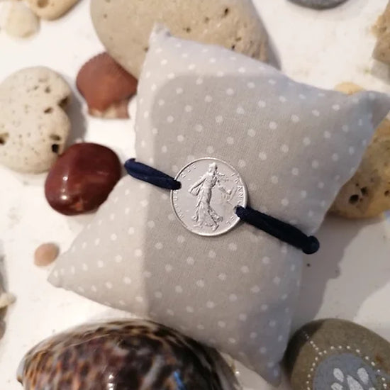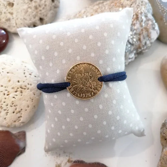 Genuine 1 franc coin plated with 24-carat yellow gold at 3 microns or in 925 silver at 10 microns, mounted on an adjustable high-end satin stretch cord.