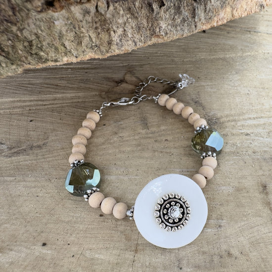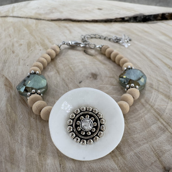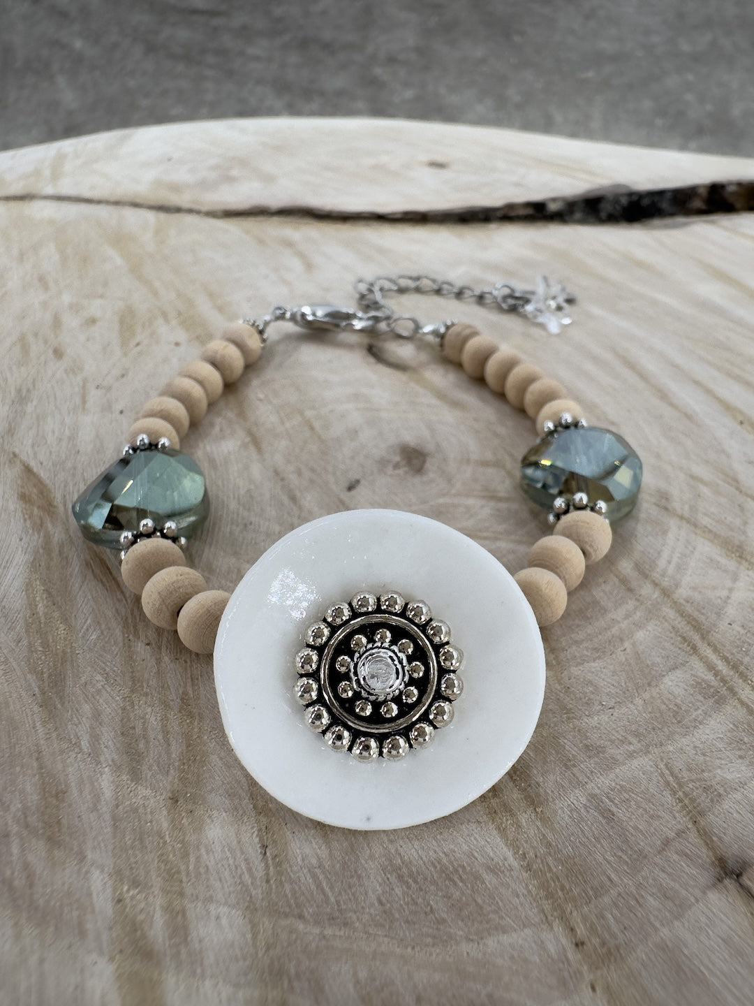 At the center lies a delicately crafted round porcelain medallion, adorned with a flat silver-toned metal bead that adds a subtle, modern touch. Each medallion is carefully shaped and finished by hand, making every bracelet unique.