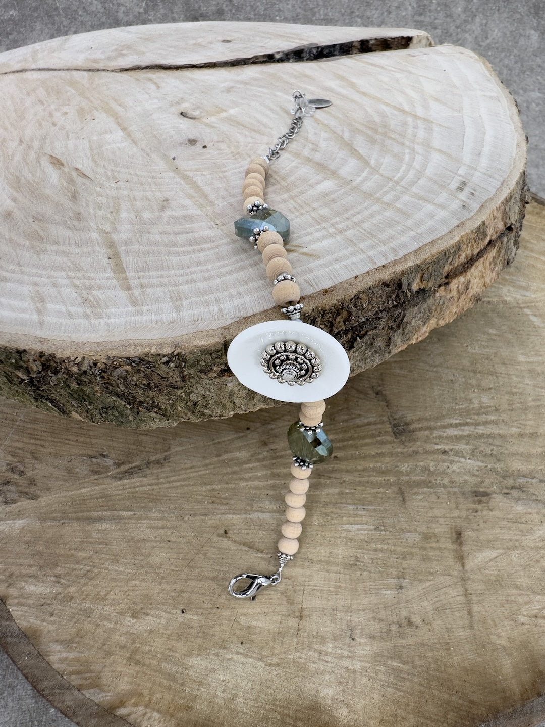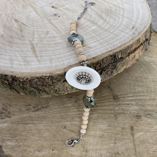 The bracelet features a strand of natural wooden beads, complemented by two wooden statement beads and an iridescent grey faceted crystal. This mix of textures brings sophistication and softness, while ensuring a balanced, harmonious look.