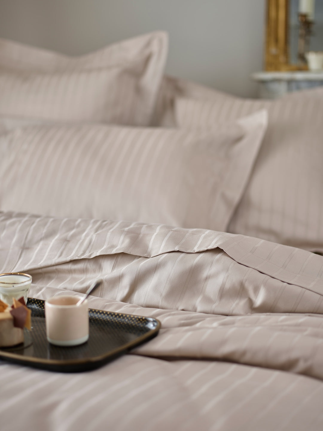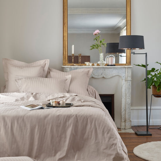 The delicate pearlescent lines and rich textures are brought to life through the art of jacquard weaving, using ultra-fine threads (120 threads/cm²) for a refined and durable finish. Its subtle sheen and timeless style elevate any bedroom with a hint of French luxury.