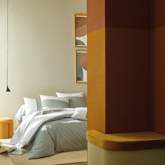 Reimagined for a modern and sophisticated interior, DUO combines two elegant shades of cotton percale: White/Hemp, White/Ochre, and White/Sage. Each piece is finished with multicolored piping, offering a chic and contemporary touch.