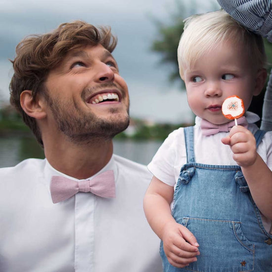 Add a touch of softness and sophistication with this Father & Son Bow Tie Set in Plain Linen Powder Pink. The gentle powder pink hue offers a refined, yet subtle pop of color, making it perfect for weddings, family celebrations, or any occasion where fathers and sons want to look their best together.