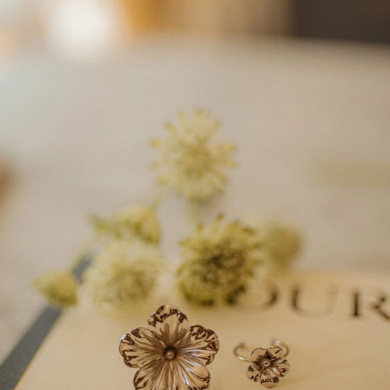 Ø 3 cm - in recycled and RJC-COC certified 24k gold-plated brass or silver plated brass with a flower or silver-plated brass with a flower.