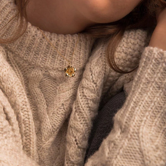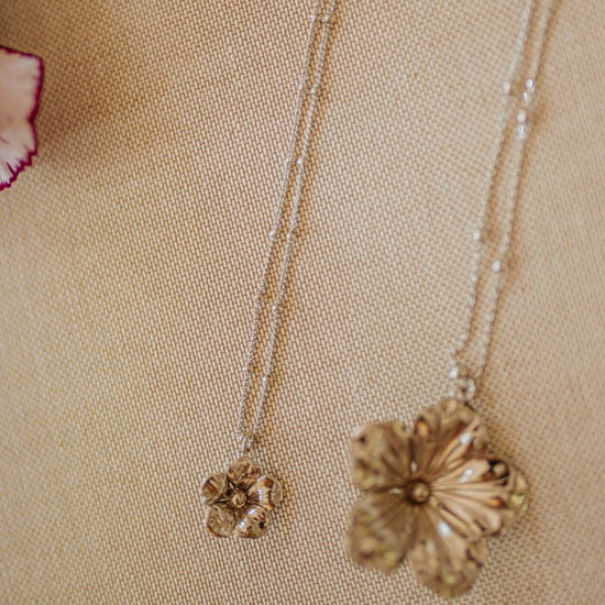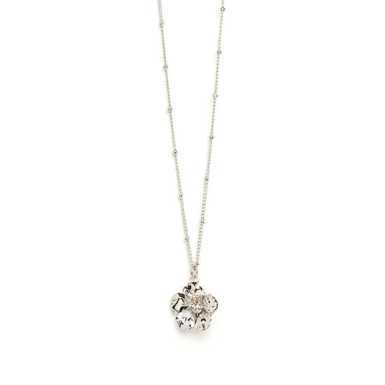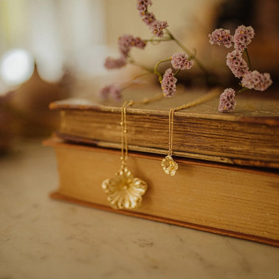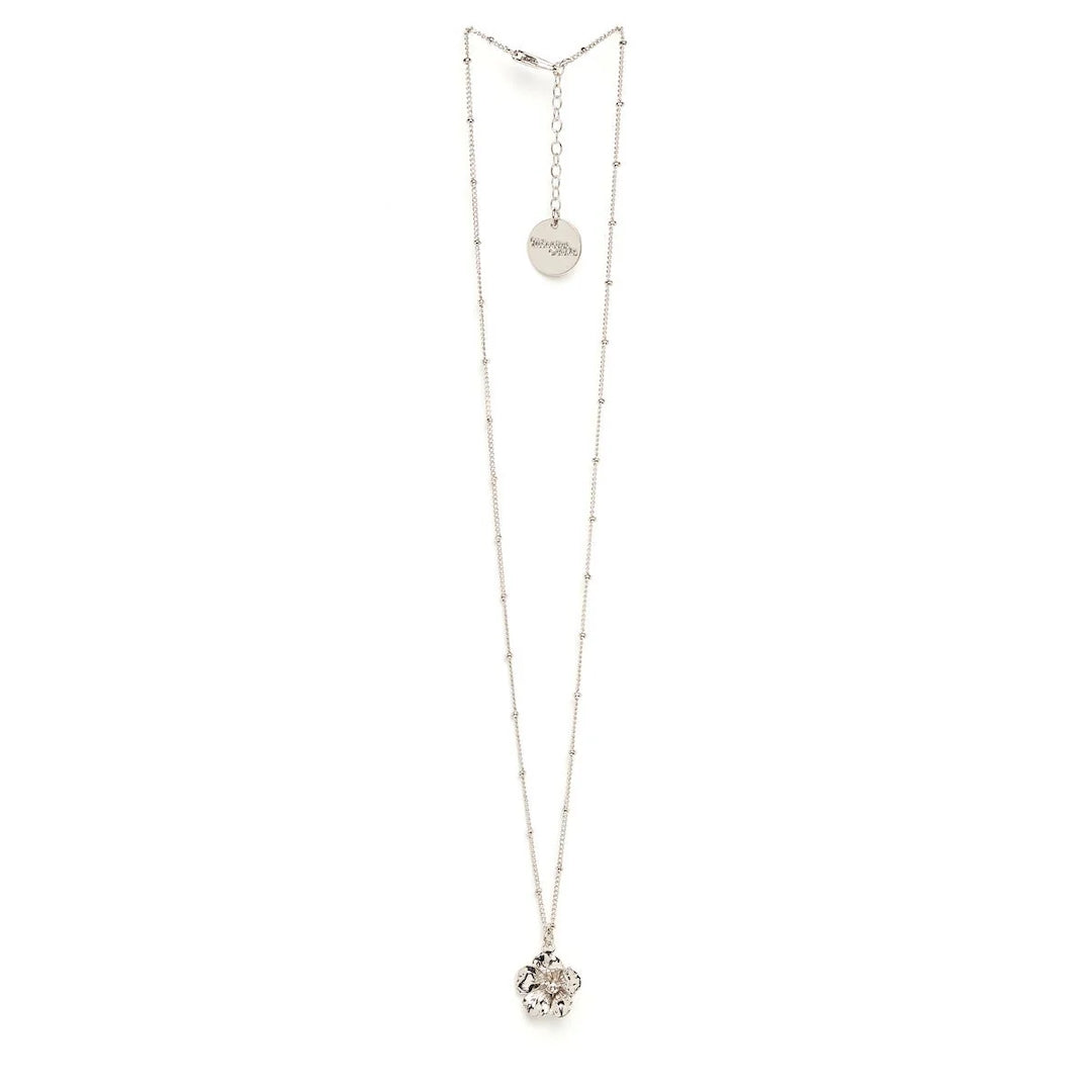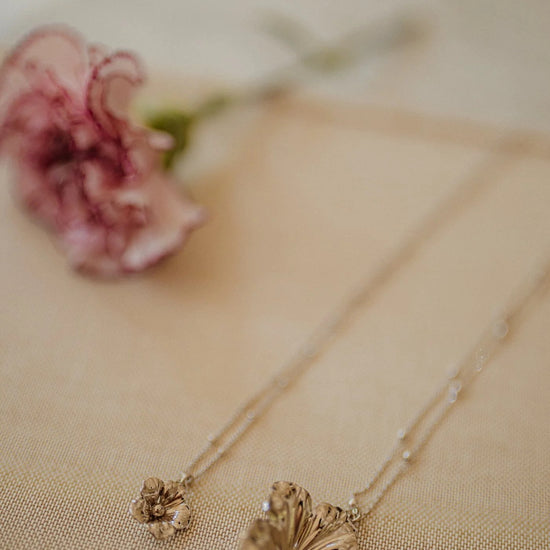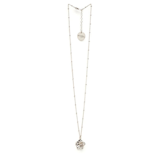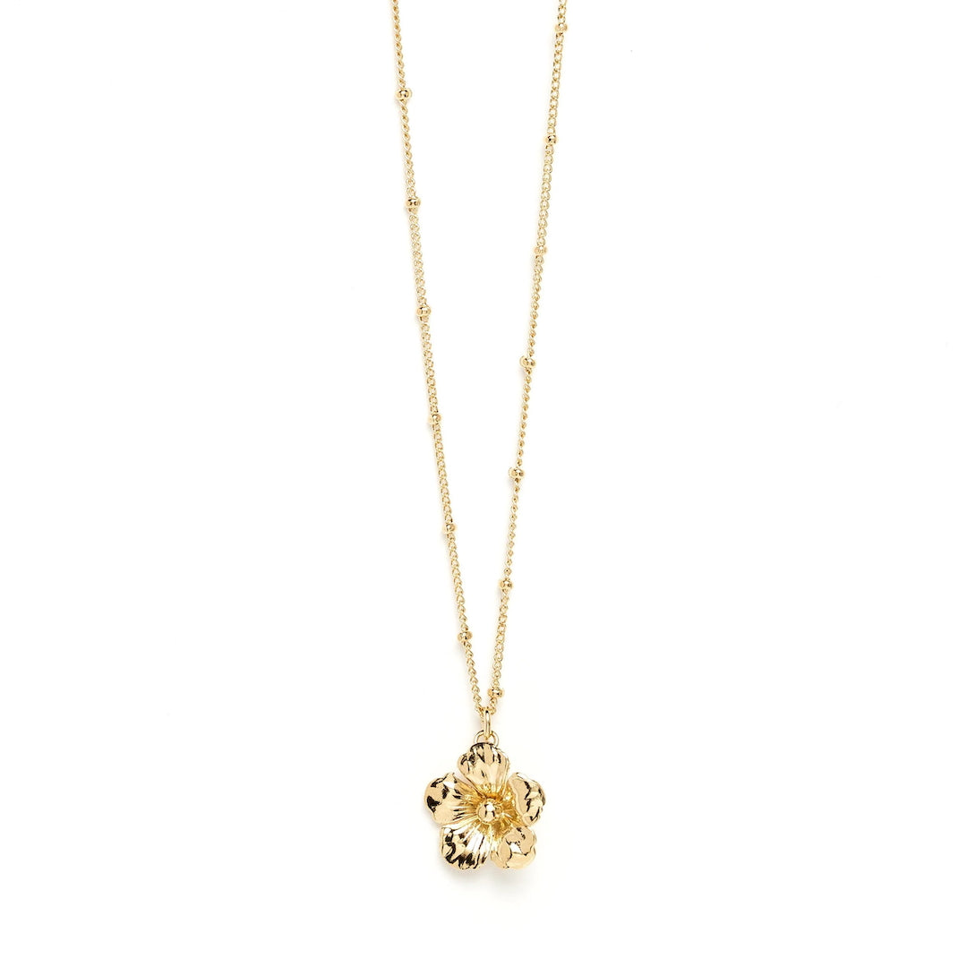 In recycled and RJC-COC certified 24k fine gold plated brass or silver plated brass with a ball chain - 40 cm - and a flower. Lobster clasp and medallion engraved with the logo.