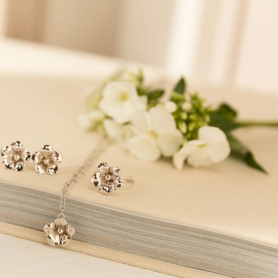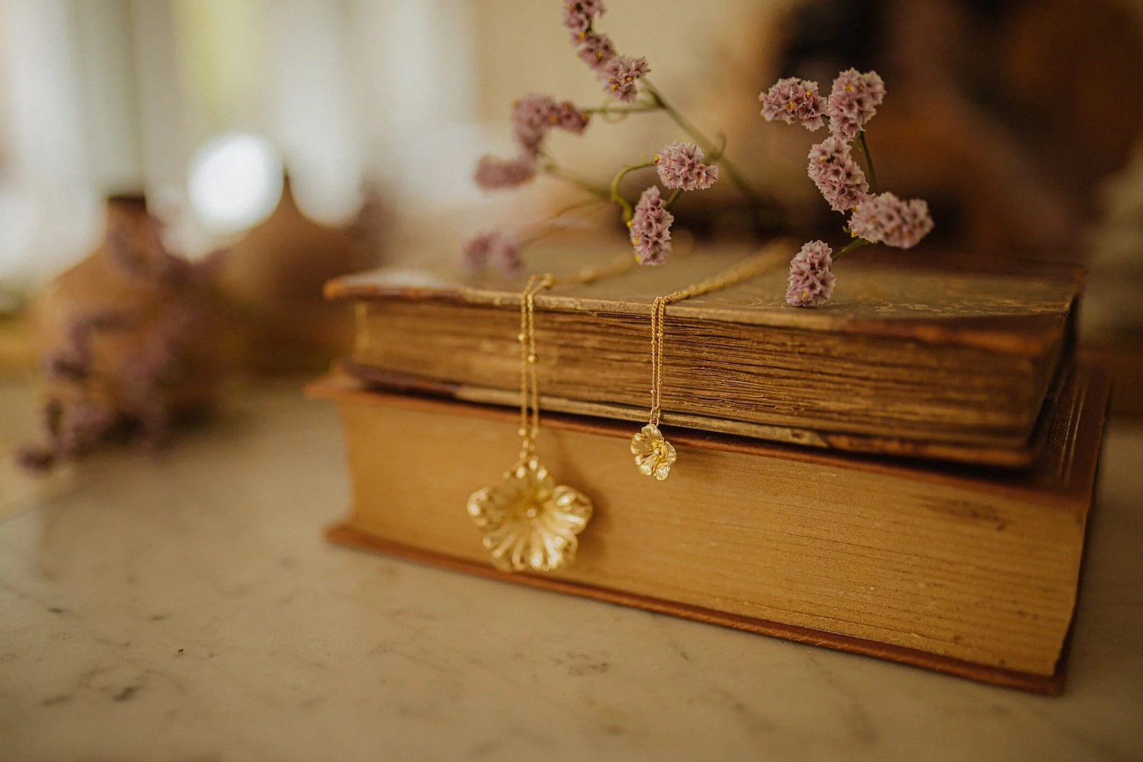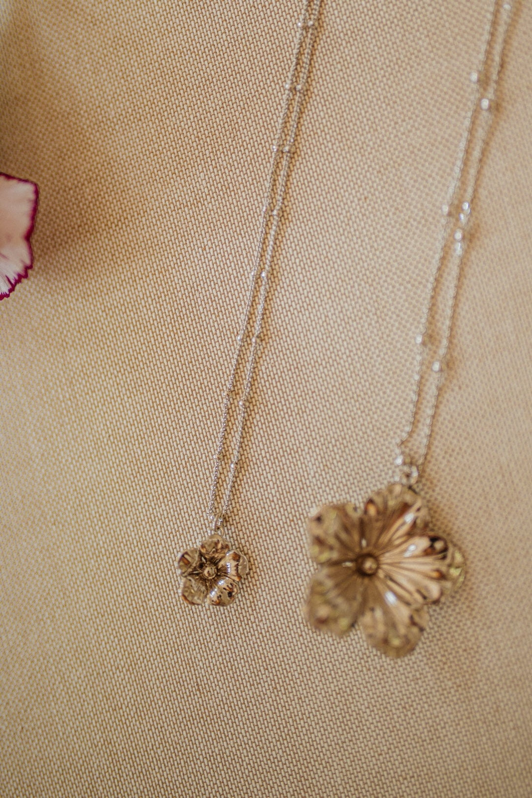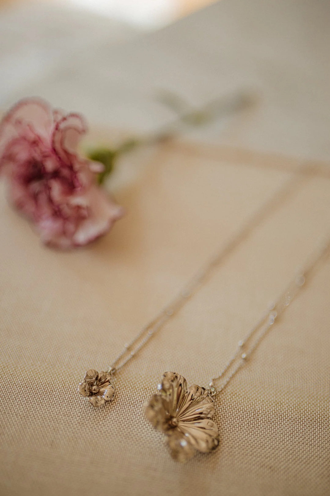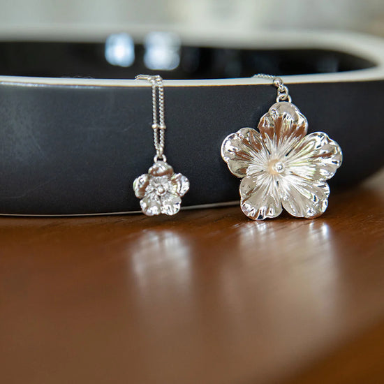 In recycled and RJC-COC certified 24k fine gold plated brass or silver plated brass with a ball chain - 40 cm - and a flower. Lobster clasp and medallion engraved with the logo.