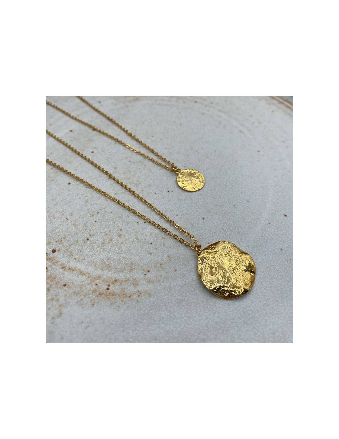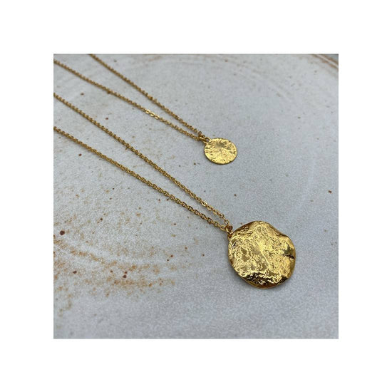 The Gloria necklace features a delicate gold-plated chain adorned with a finely crafted round pendant showcasing a unique molten effect.