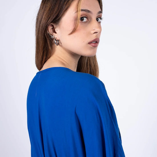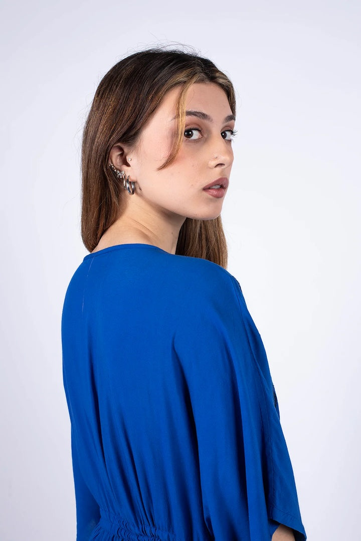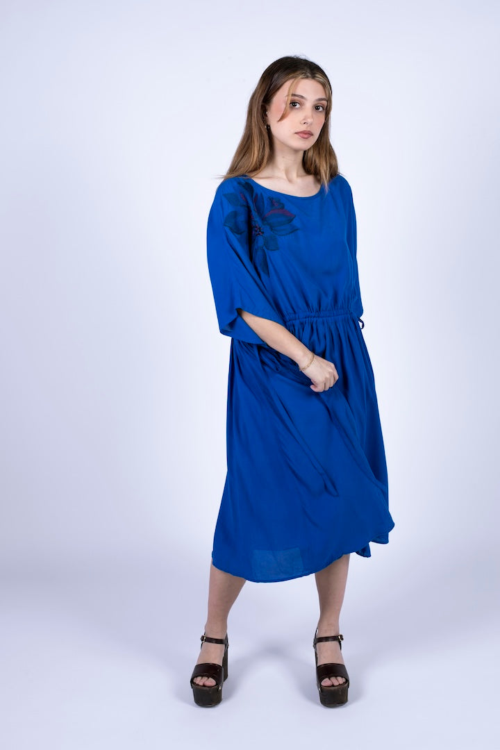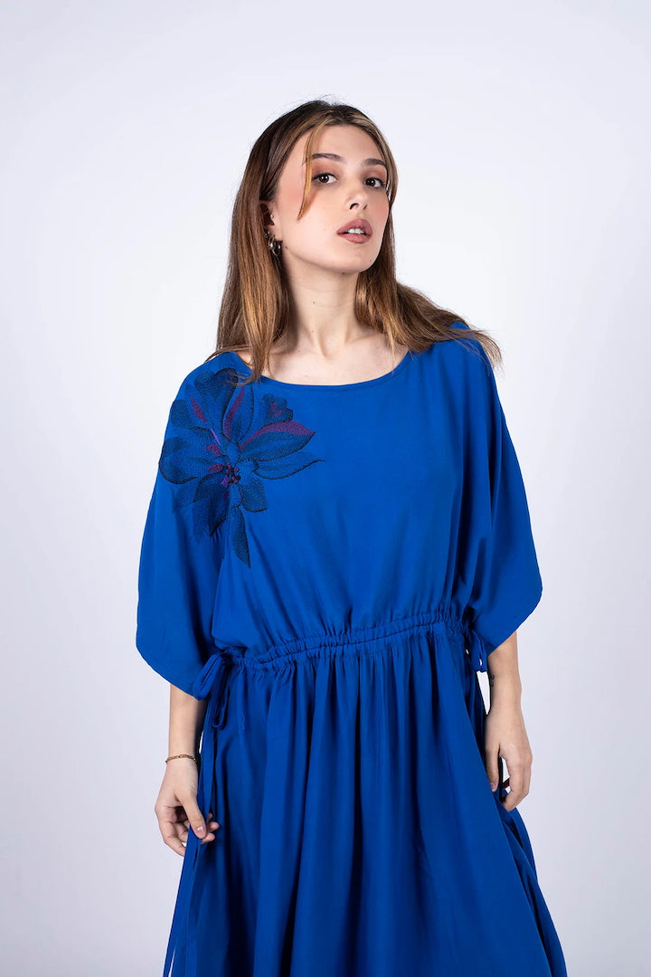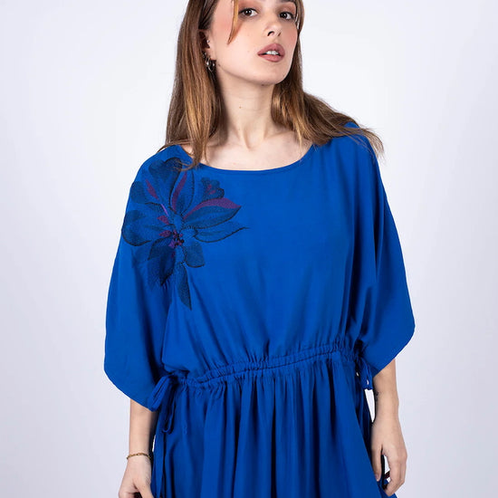 The Hoshi Indigo Dress is crafted from ECOVERO™️ rose petal fiber, ensuring unparalleled comfort while being