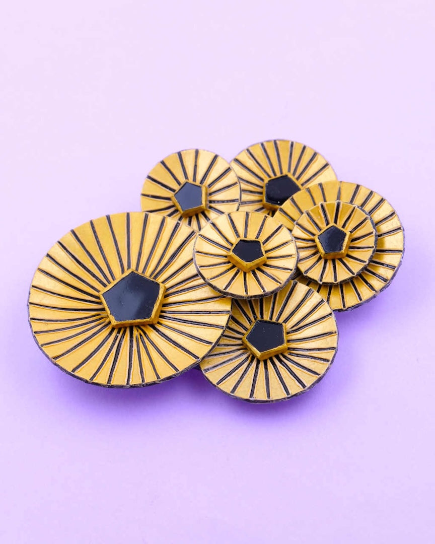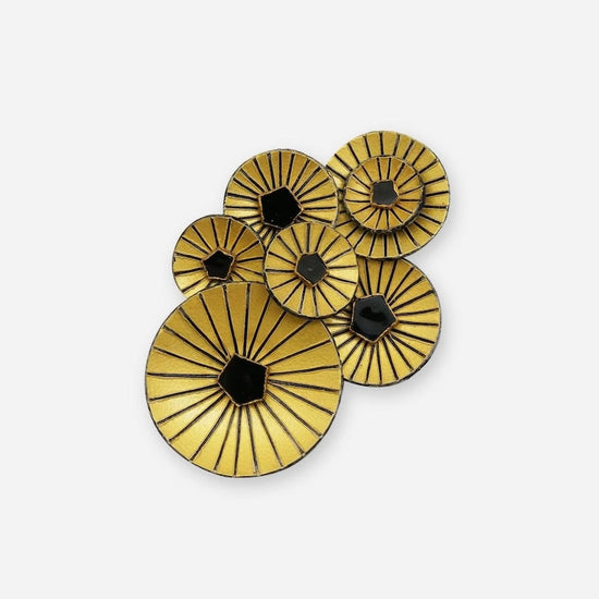 Composed of seven golden circles, fine black lines, and hexagonal hearts, the Kyoto Brooch draws inspiration from the ancient wisdom and harmony of Kyoto — a city steeped in tradition, spirituality, and aesthetic beauty. This theme echoes the legend of the “Seven Sages of Kyoto,” mythical figures representing the virtues that sustain the city’s spiritual and artistic balance.