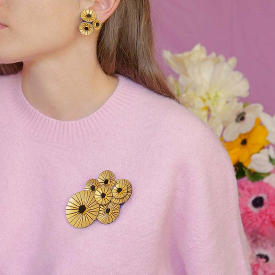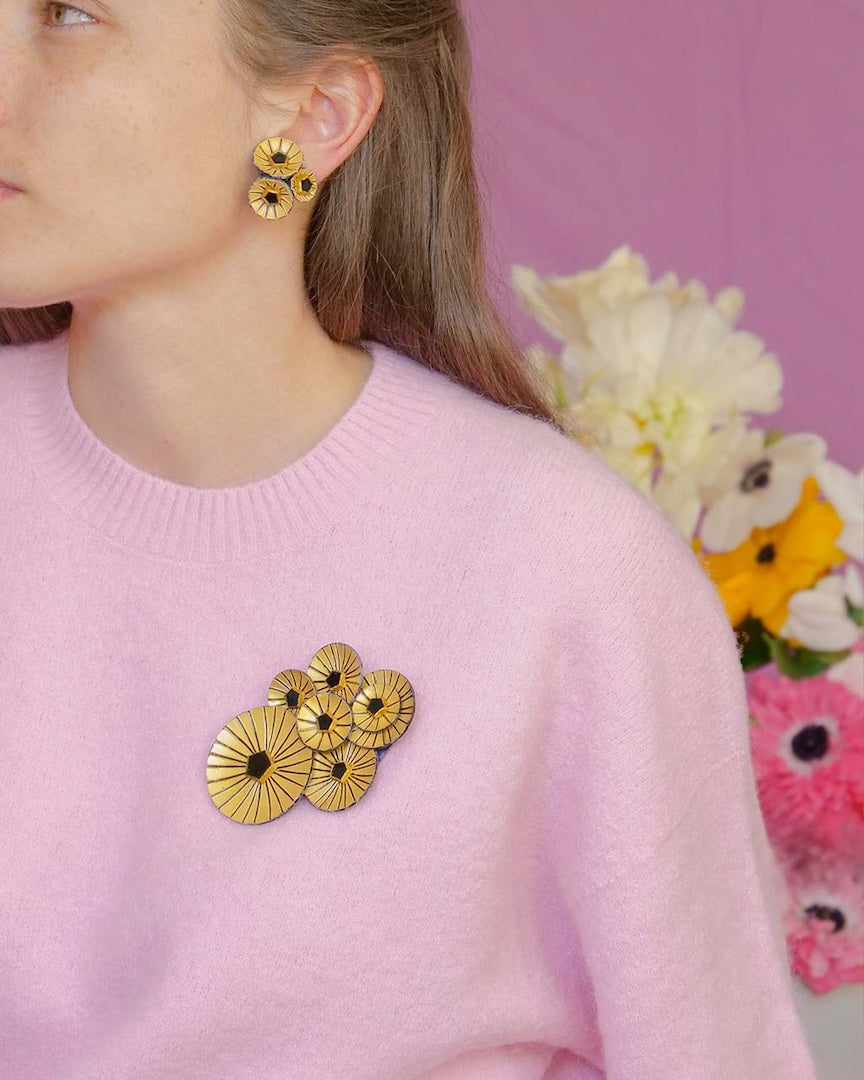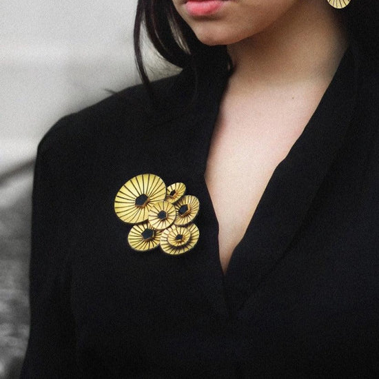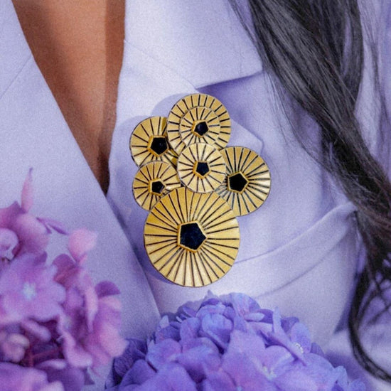 The Kyoto Brooch stands out through its striking contrast of black and gold, expressing refined elegance. Each pigment is hand-mixed and delicately applied to achieve deep, lasting tones. The golden finish brings a subtle radiance, making it suitable for any occasion. This thoughtful balance of color and form results in a timeless piece — a design meant to transcend fleeting trends.