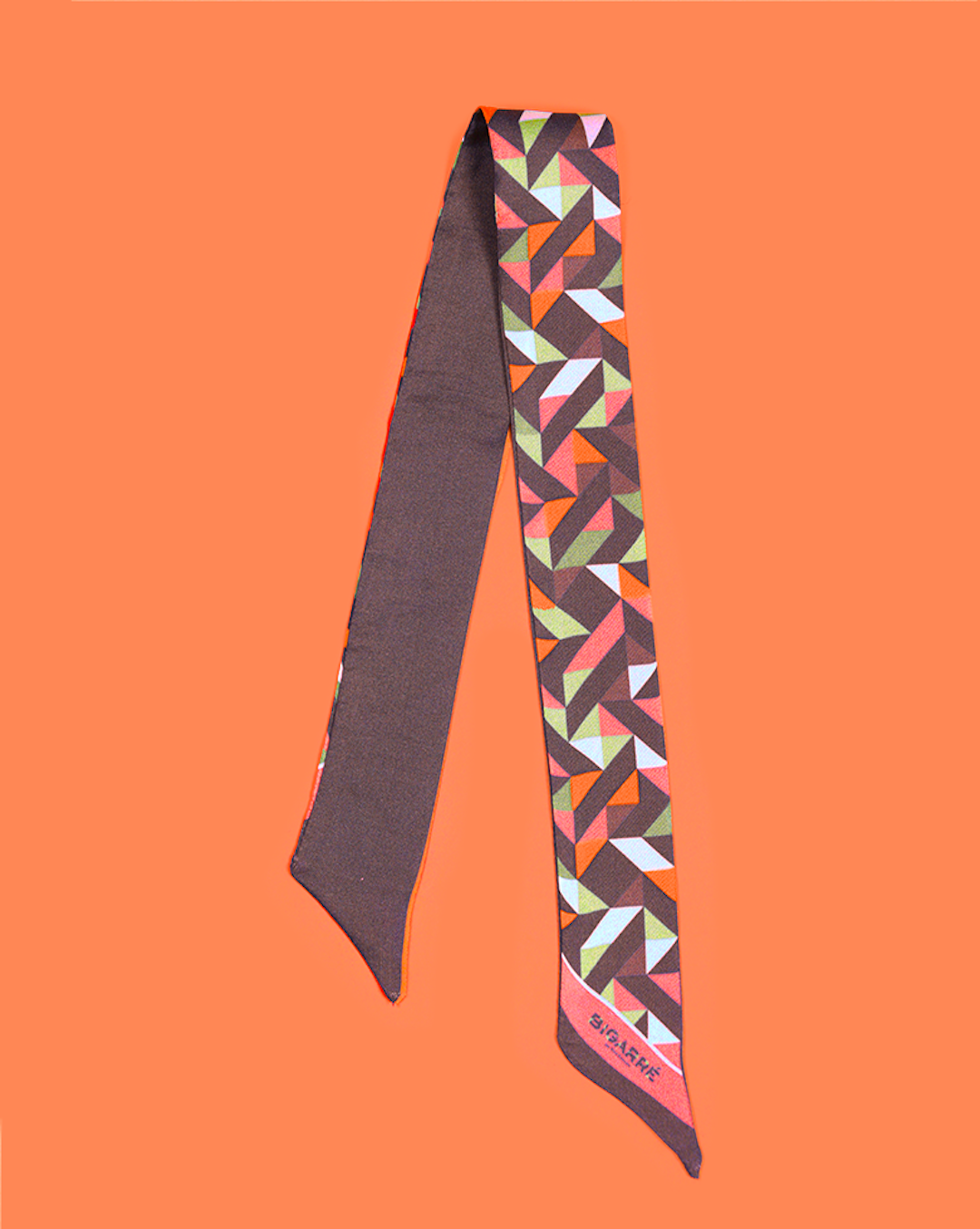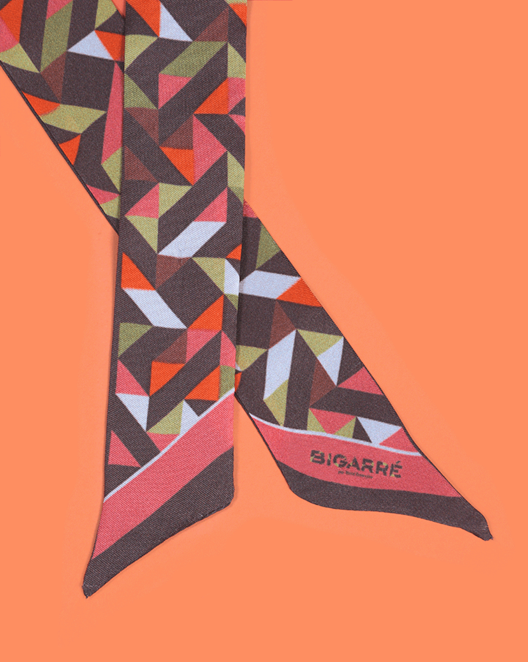 Discover French elegance with Le Magnifique Tan – Bismarck Brown & Pink Incarnat, a limited-edition piece created, woven, printed, and made in France. Part of the Tan series, this silk print features a vibrant composition of interwoven colorful triangles, inspired by the geometric shapes and bold color contrasts of the 1970s. The design pays tribute to the famous Tangram, the iconic Chinese puzzle that plays with form and creativity.