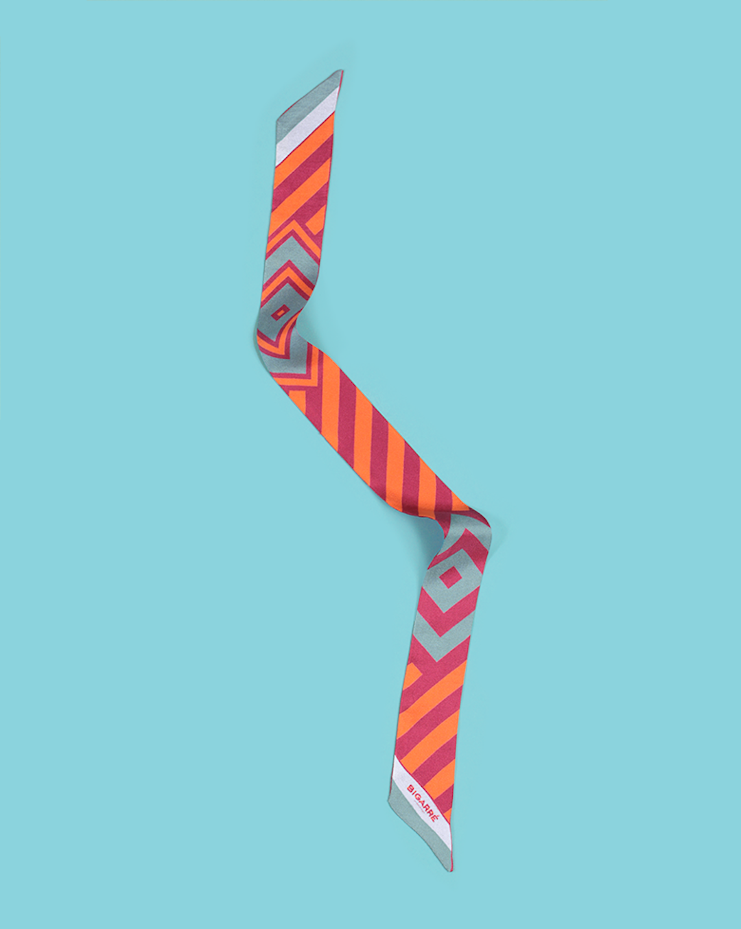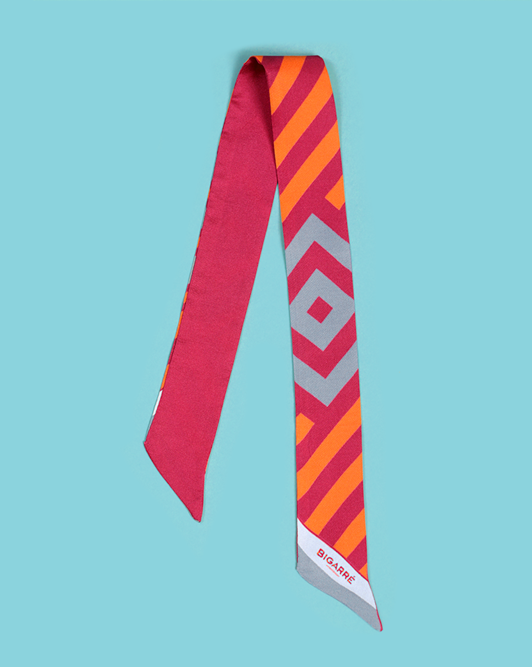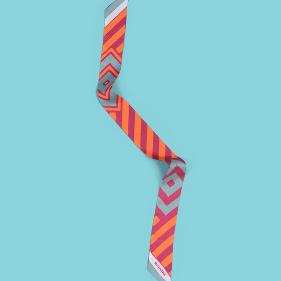 Discover French elegance with Le Magnifique Victor – Crushed Strawberry & Mandarin, a limited-edition piece created, woven, printed, and made in France. Part of the Victor series, this silk print features a bold composition of diagonal lines and colored squares, inspired by the geometric abstract paintings of visual artist Victor Vasarely, the father of Optical Art, renowned for his masterful use of minimal shapes and colors.