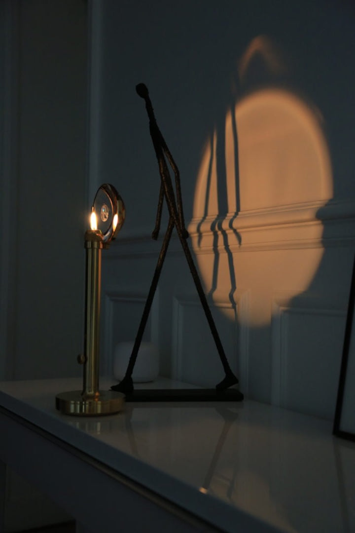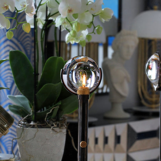 Around its luminous core, a subtle halo envelops the candlestick, merging delicately with its form. Placed on a mantel or centrepiece, this living light gently vibrates with the air, projecting a poetic, immersive atmosphere that animates the room.