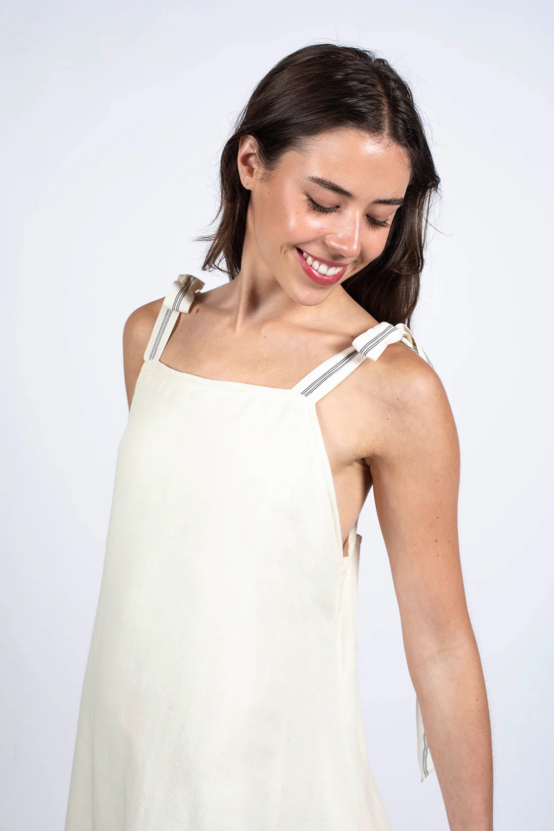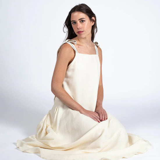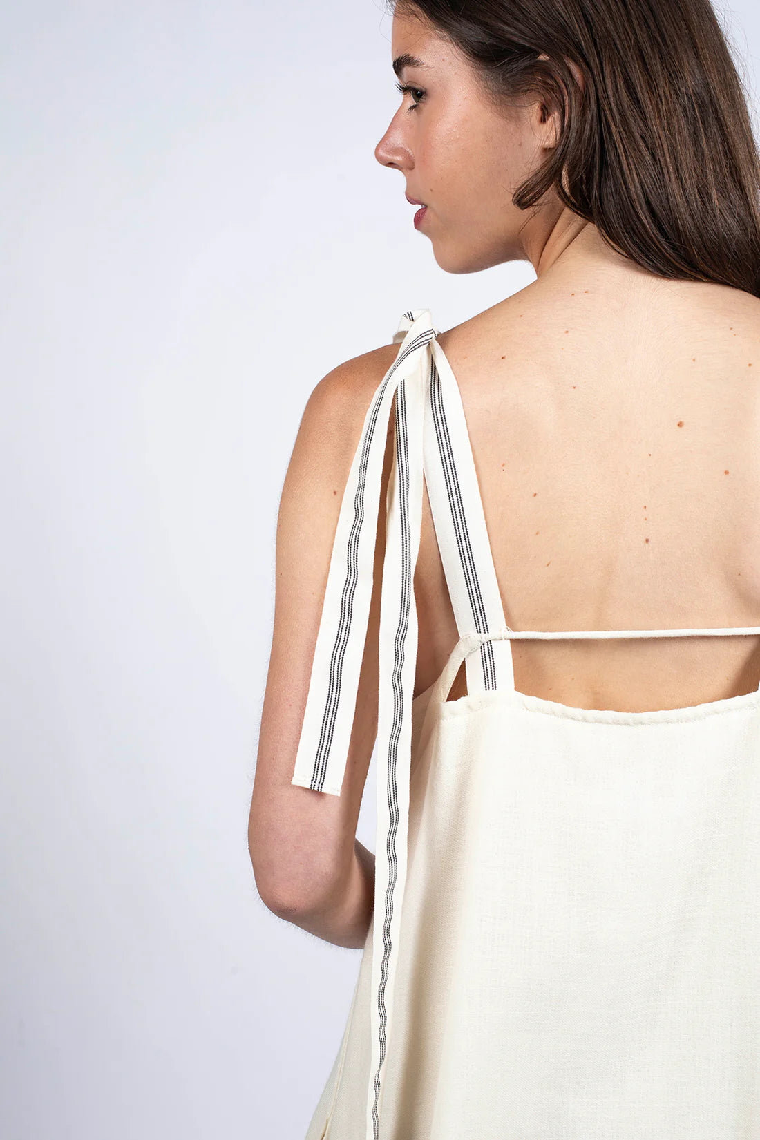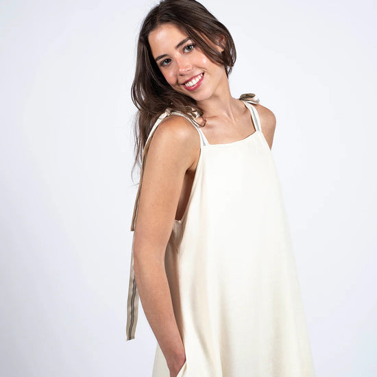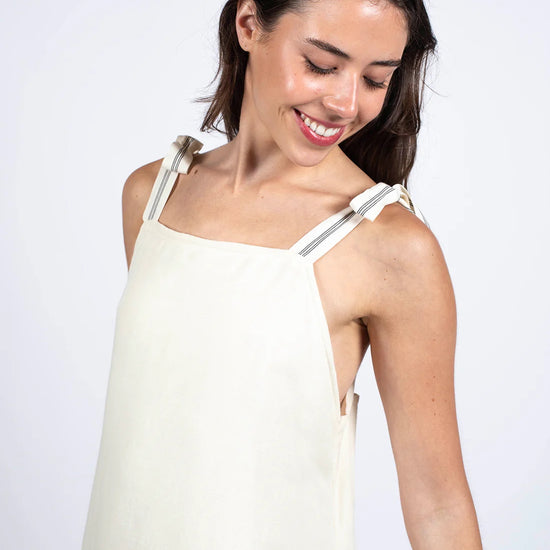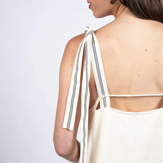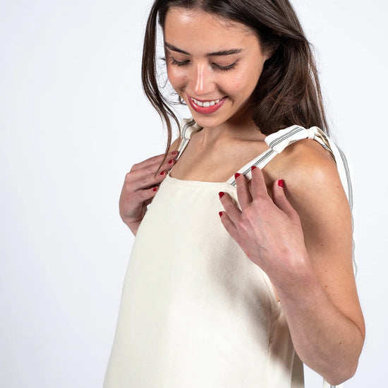 Crafted in France from a blend of 60% upcycled cotton and 40% linen, the Loane Dress embodies the essence of eco-responsible fashion. Its loose fit and wide straps add a touch of relaxed