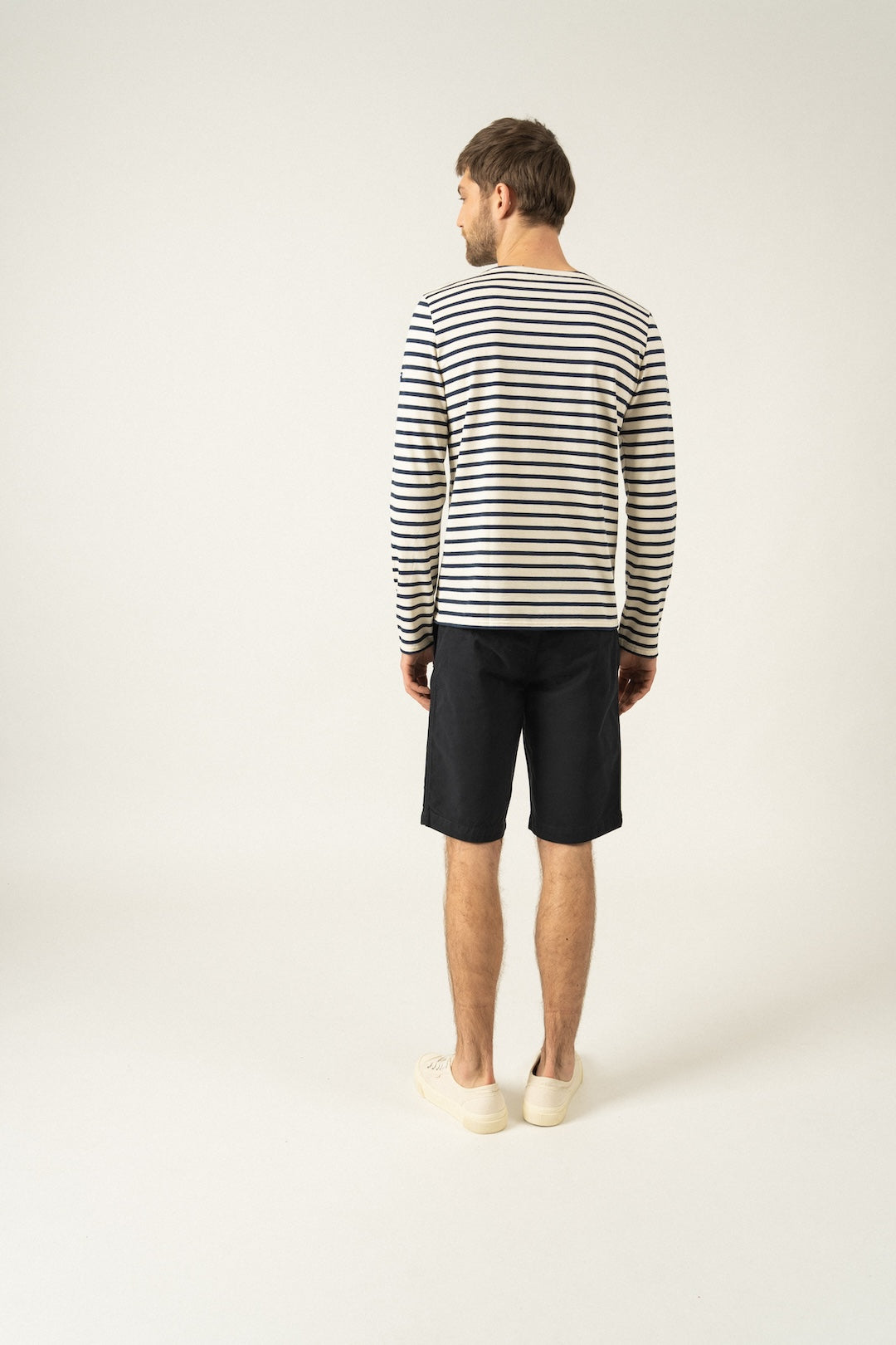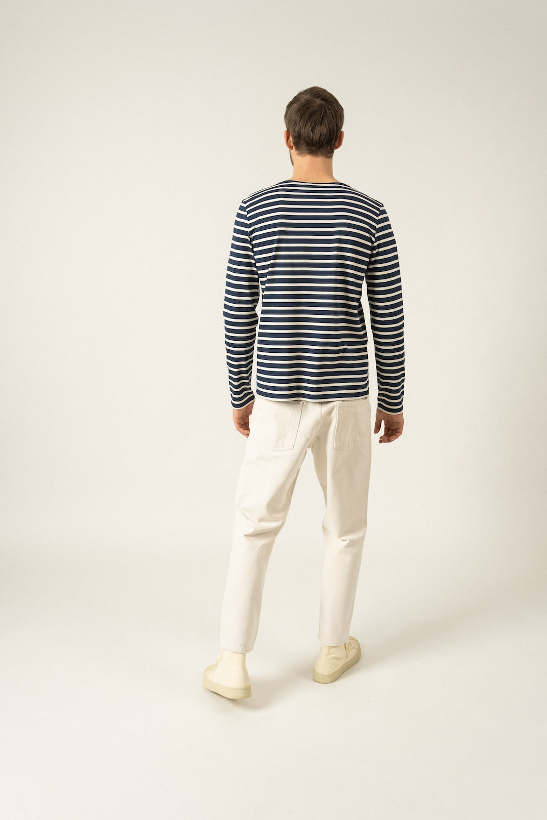 Designed to suit both men and women, the Minquiers ecru/marine top offers a flattering, relaxed fit. The breathable carded jersey fabric ensures comfort, shape retention, and long-lasting color, making it a reliable wardrobe staple season after season.