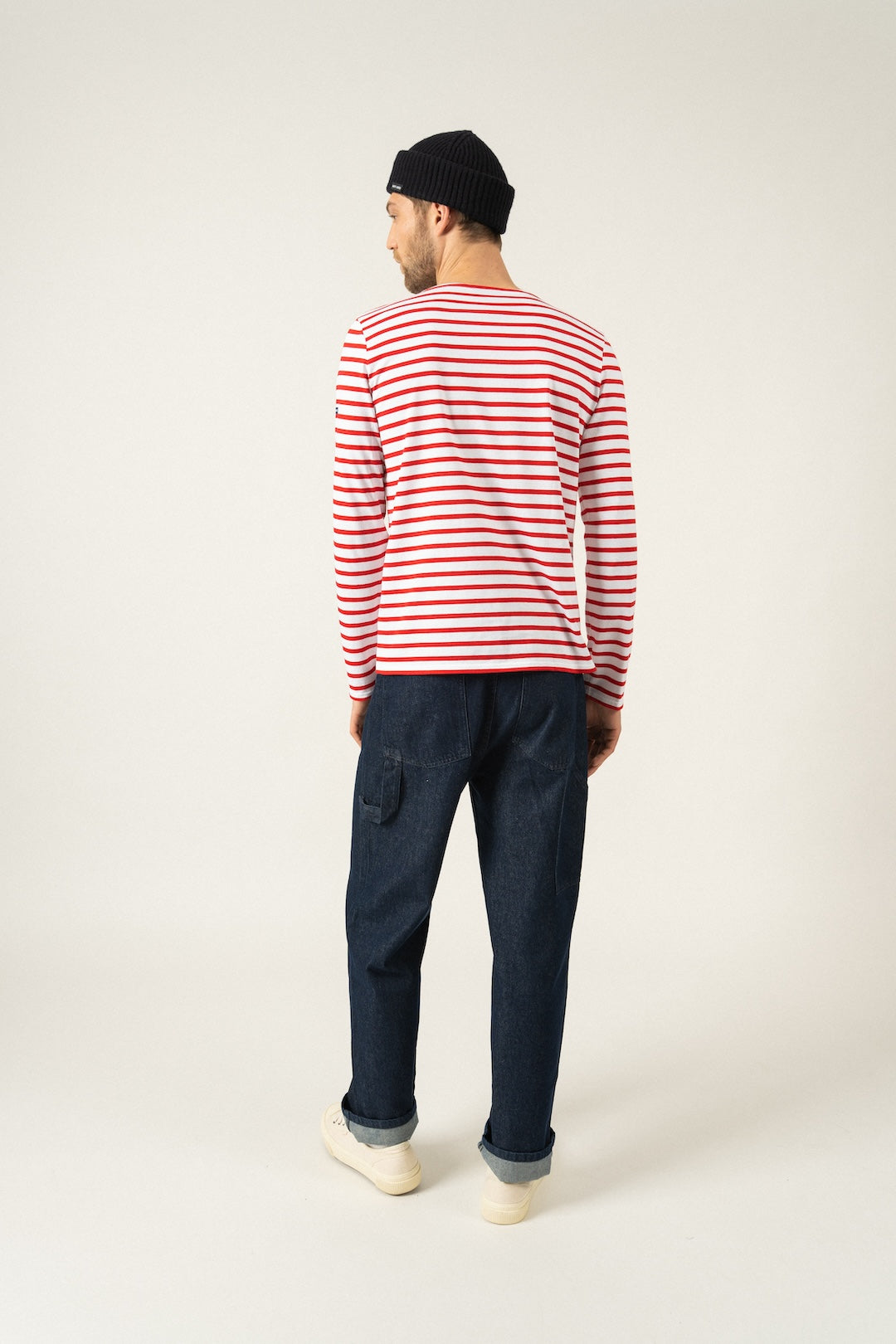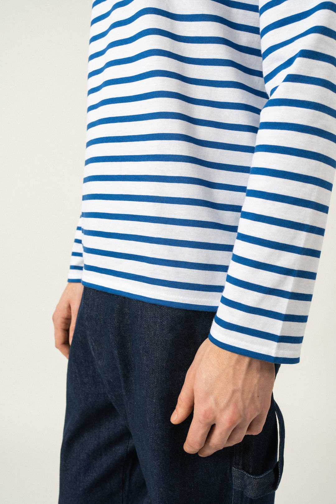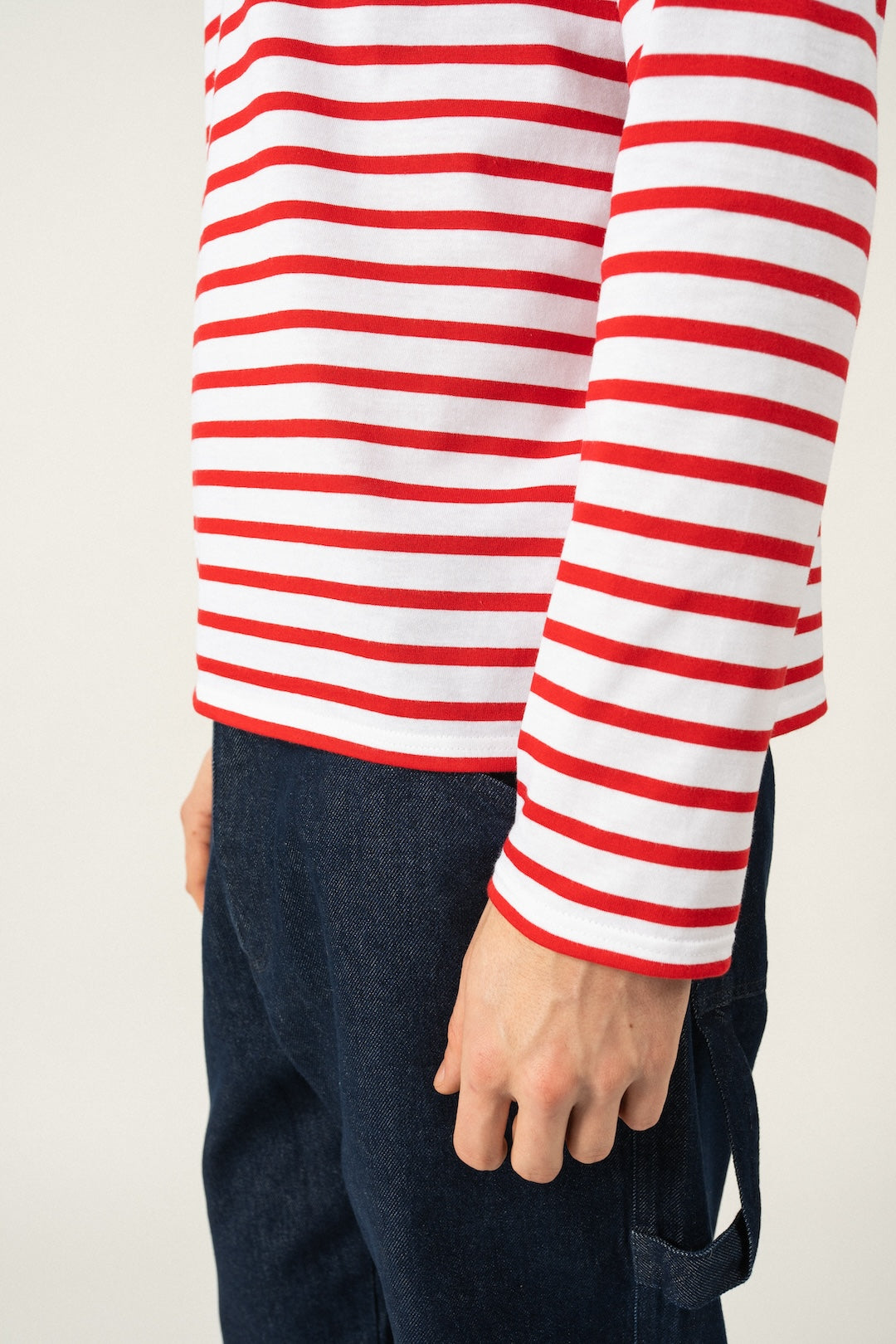Designed for men and women, the Minquiers neige/gitane top offers a flattering, relaxed fit. Durable and easy to maintain, it retains its shape and vivid colors, making it a versatile wardrobe essential for all seasons.