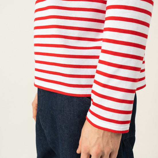 The Saint James Minquiers striped sailor top in neige/tulipe combines classic Breton heritage with a playful modern touch. Made from soft, durable carded jersey, this lightweight top offers comfort and freedom of movement for every season, whether at sea or in the city.