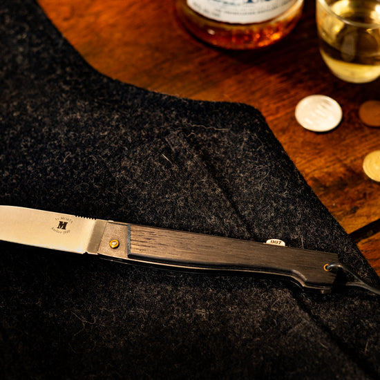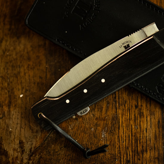 Contemporary in its minimalist curves yet charmingly retro in its visible pump-lock silhouette, the Morta Pump remains unmistakably part of the Morta family. Signature details include a brass lace-pass, brass rosette fastenings, a generously proportioned blade and a handle covered with Morta (ancient bog oak), giving each knife a unique patina over time.