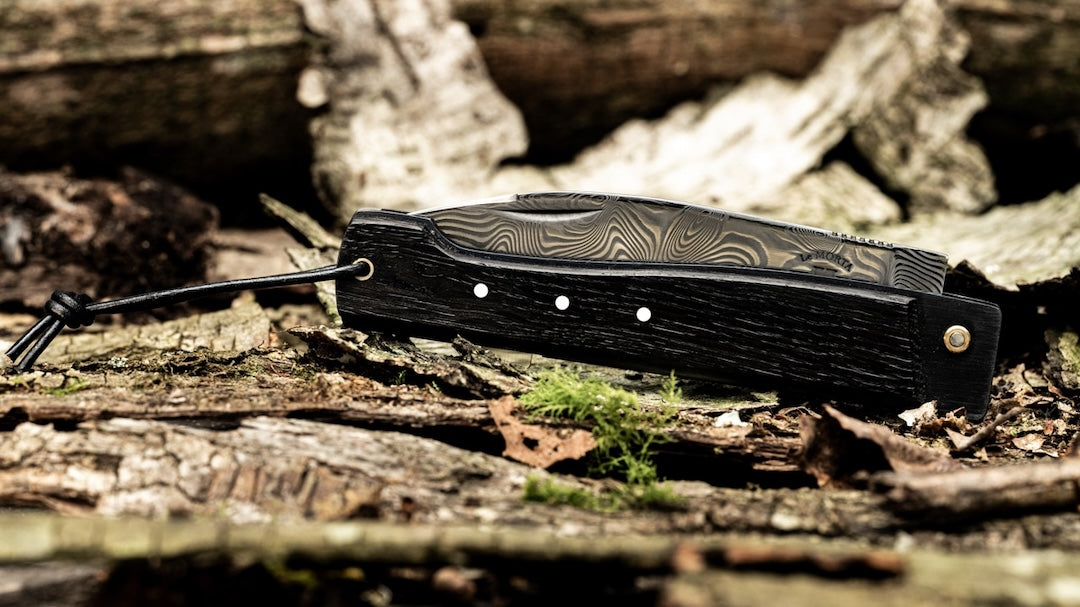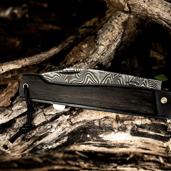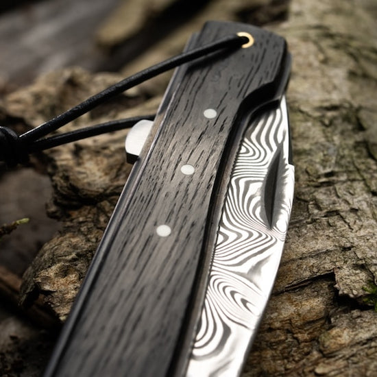 The Morta Lock Back knife features an exquisite stainless Damascus steel blade, forged by Marcus Balbach and revealed in our workshop. Composed of N690 steel and DE 45ncd16, folded over 120 layers for a 61 HRC hardness, this blade is both stunning and highly functional.
