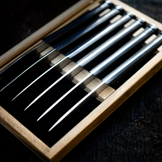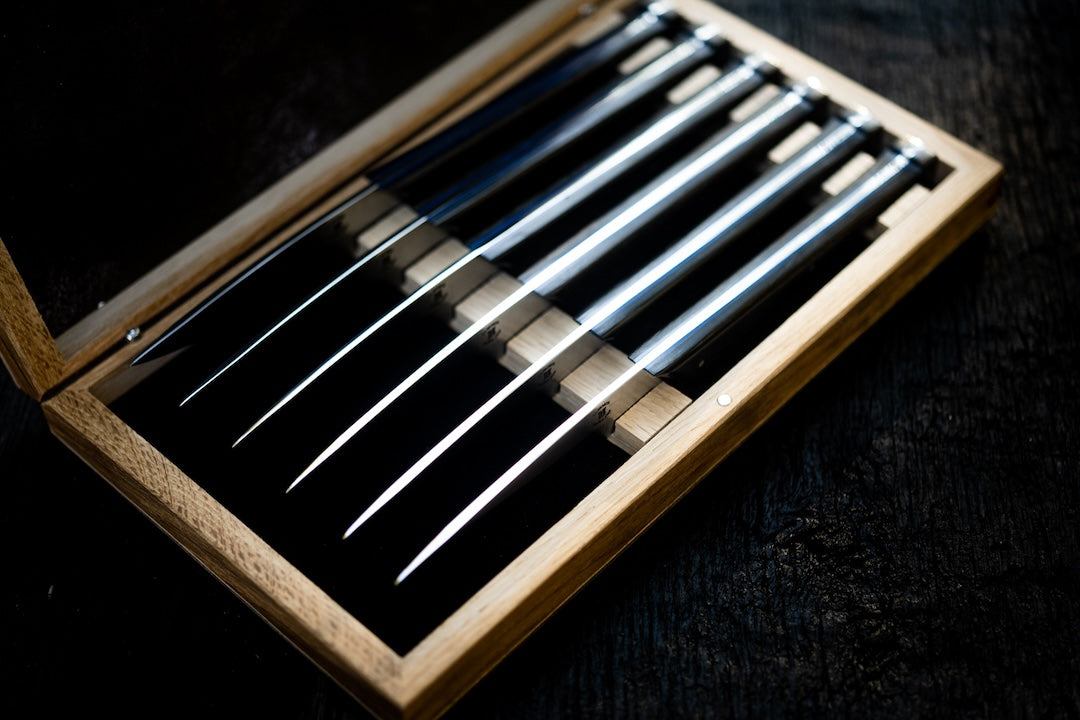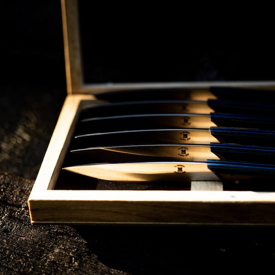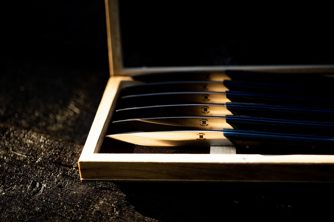 Whether for a family dinner or a gathering with friends, these knives will make a striking impression on your table. Presented in a beautiful wooden case handcrafted in a Charente workshop, they bring an extra touch of refinement to your dining experience.