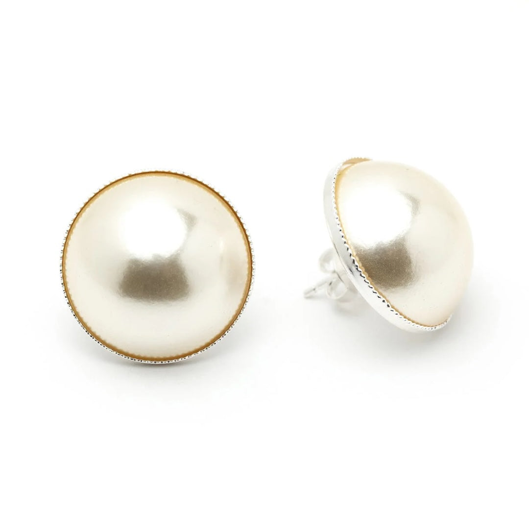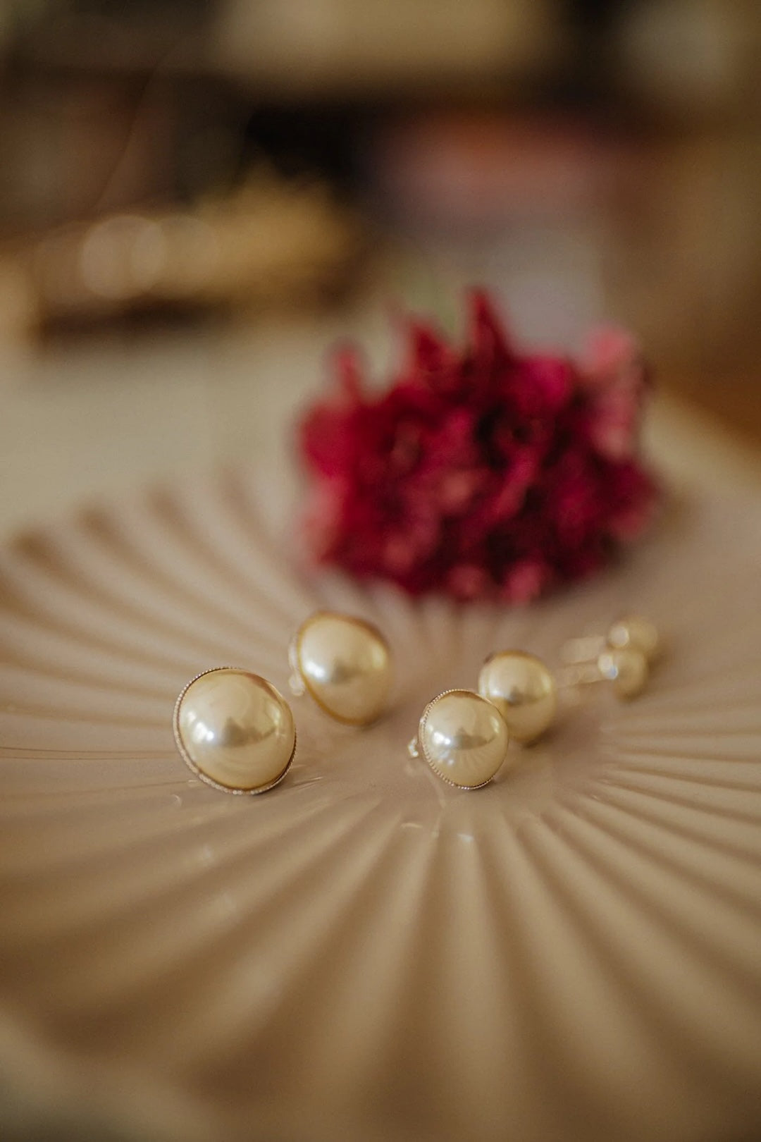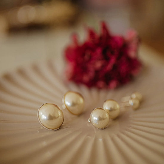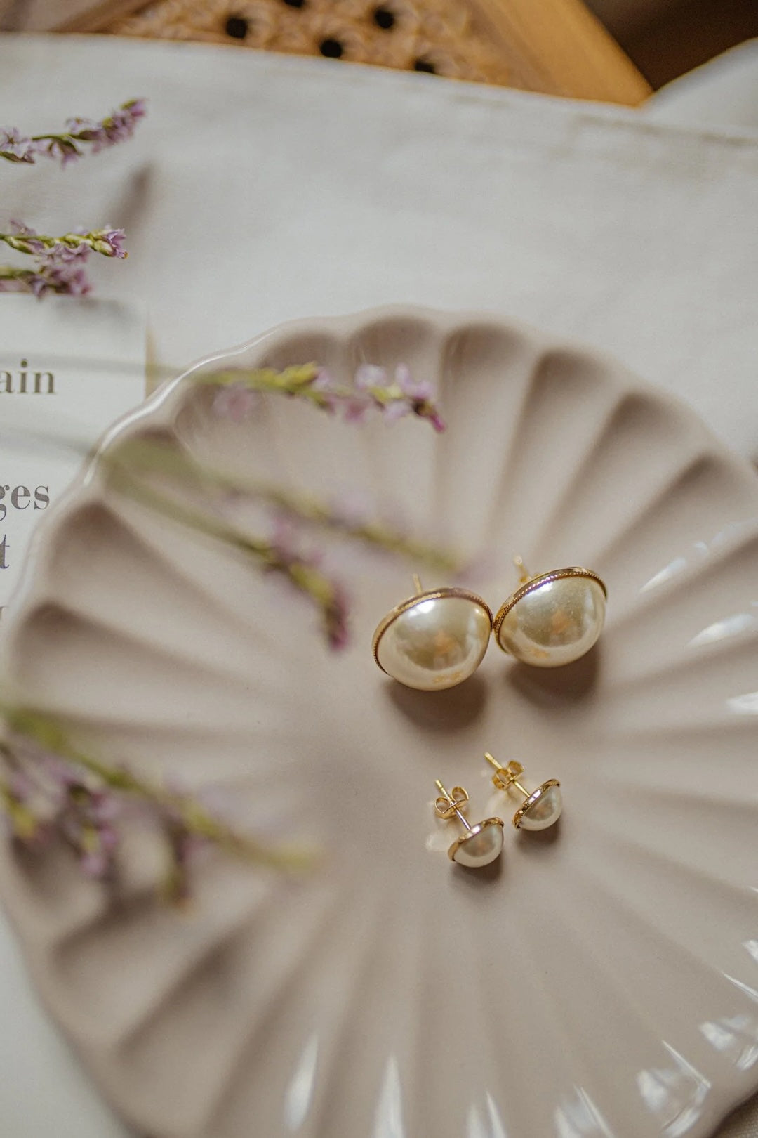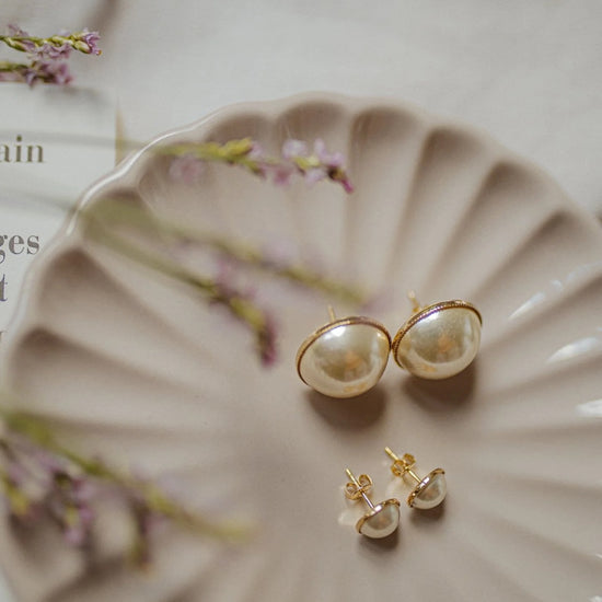 Ø 2.2 cm - in recycled 24k gold-plated brass and RJC-COC certified or silver-plated brass with two cream cabochon beads. The fastening rods and clasps are made of 925 silver to avoid any risk of allergy.