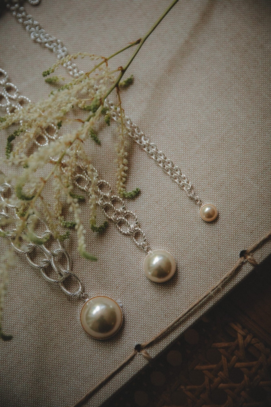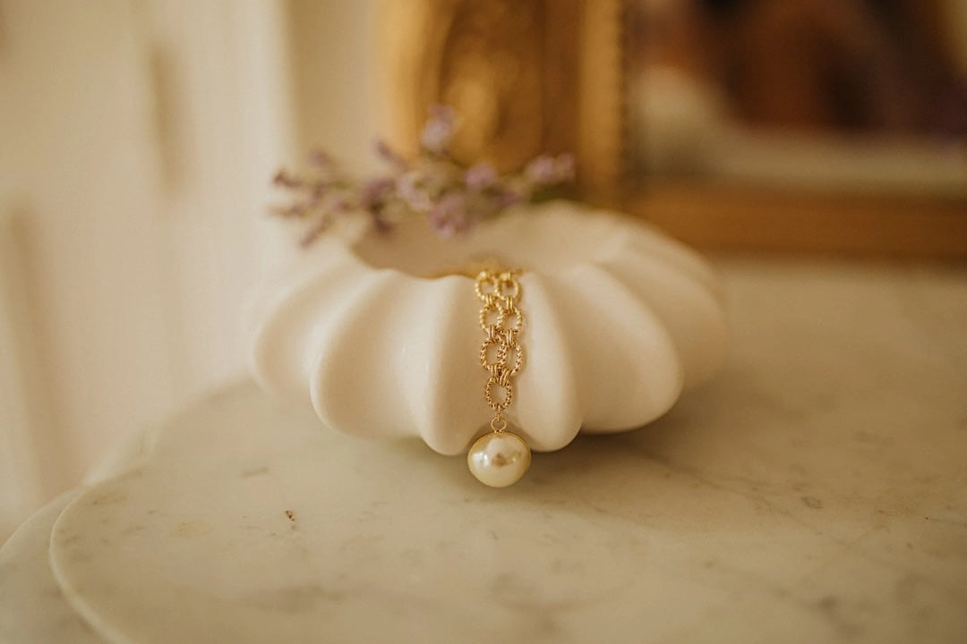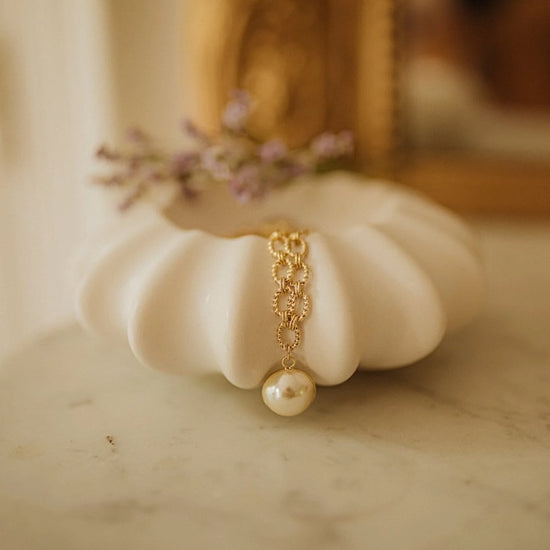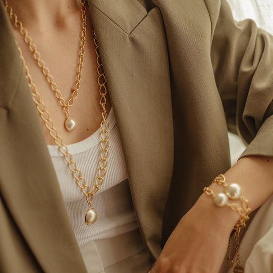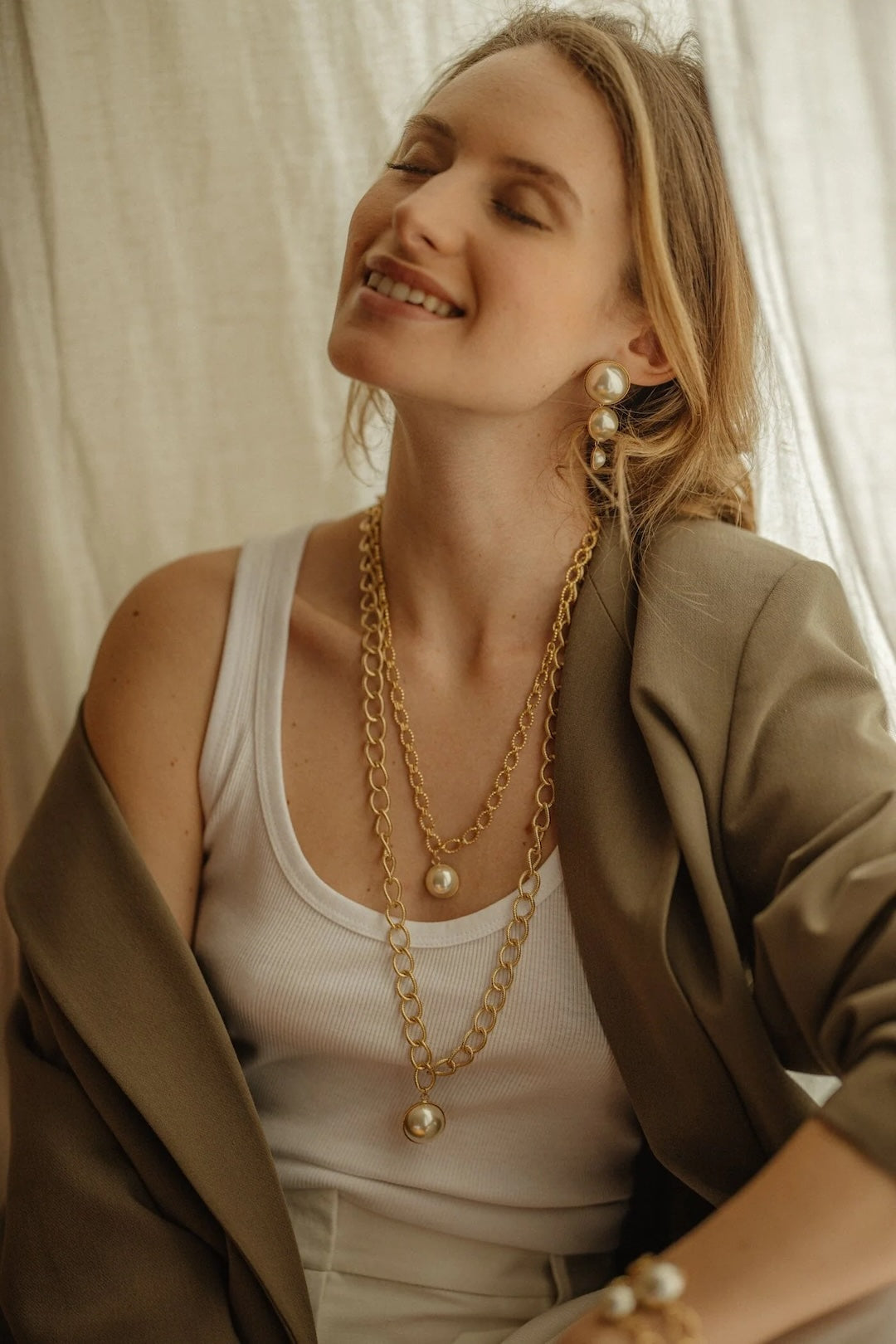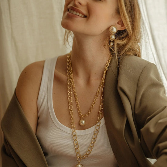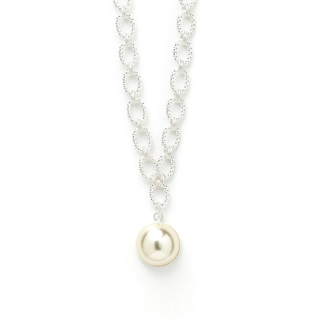 in recycled and RJC-COC certified 24k gold-plated brass or silver-plated brass with a double ring link chain - 40 cm - and a cream cabochon bead Ø 1.8 cm. 3 cm adjustment chain, lobster clasp and medallion engraved with the logo.