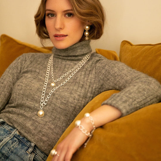 The Nélya Maxi Necklace by Monsieur Simone is a bold, sculptural piece handcrafted in Paris. Its fluid, organic design creates a striking silhouette that elevates any outfit — from minimalist chic to evening elegance. Despite its size, it remains lightweight and comfortable, offering maximum visual impact with refined ease.