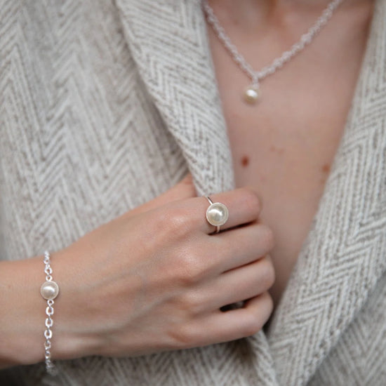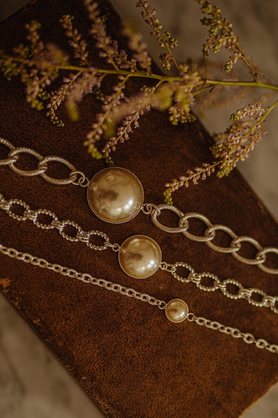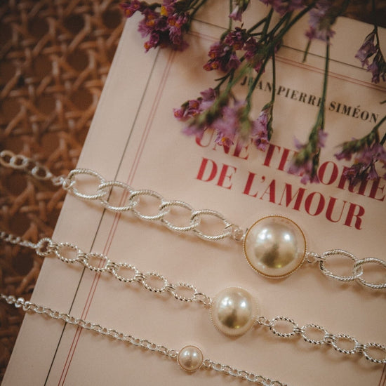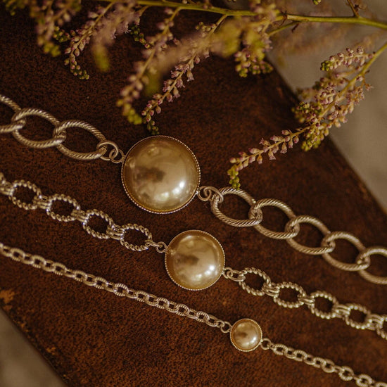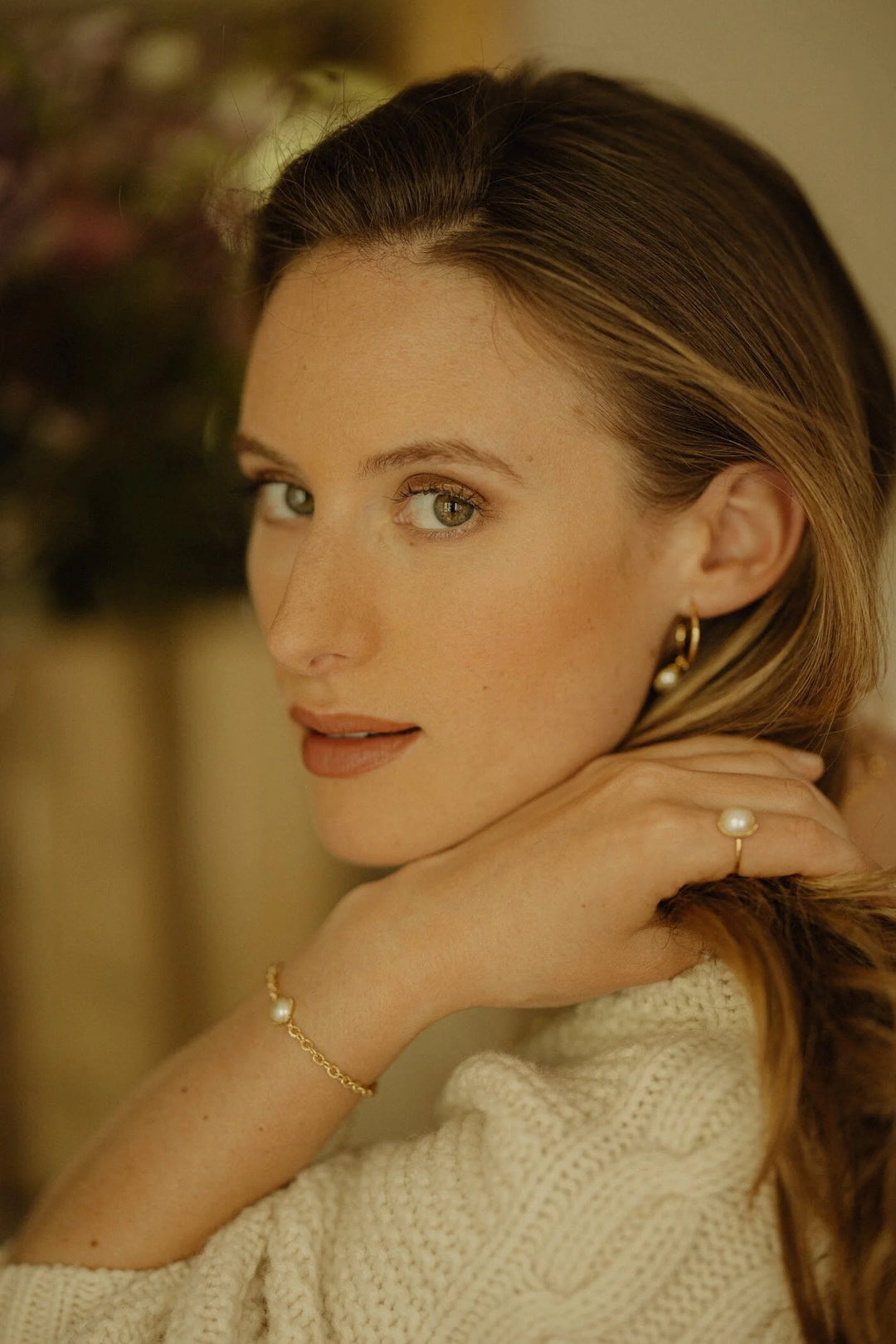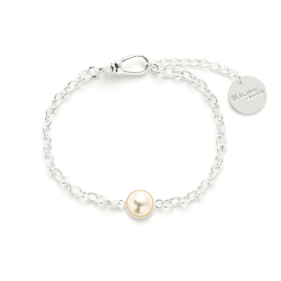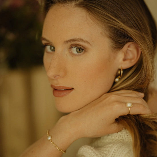 In recycled and RJC-COC certified 24k gold-plated brass or silver-plated brass with a cable chain and a cream cabochon bead Ø 1 cm. 3 cm adjustment chain, lobster clasp and medallion engraved with the logo.