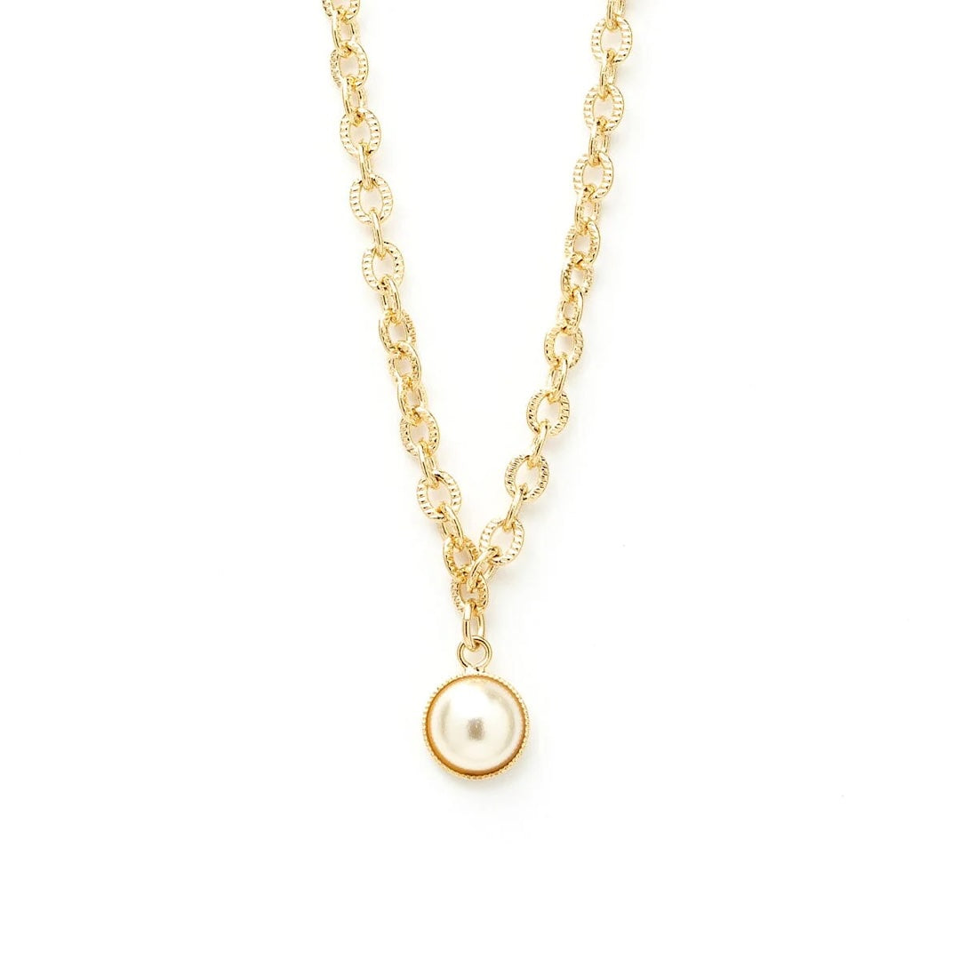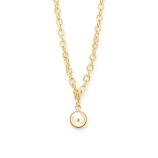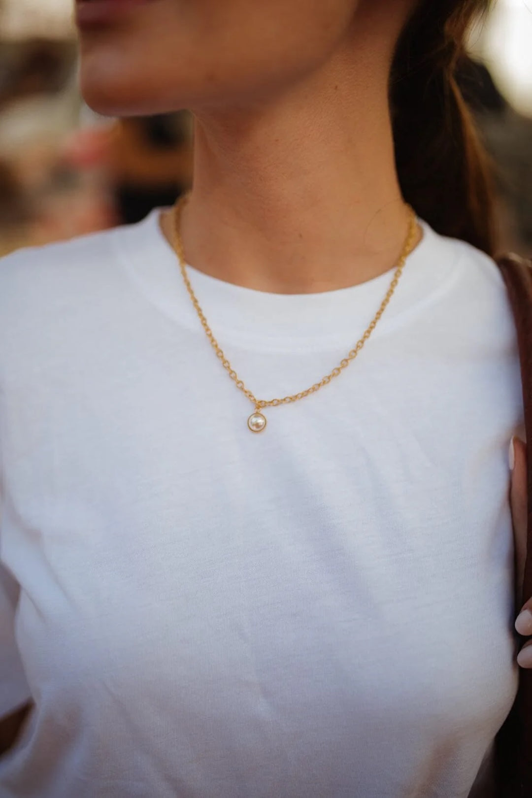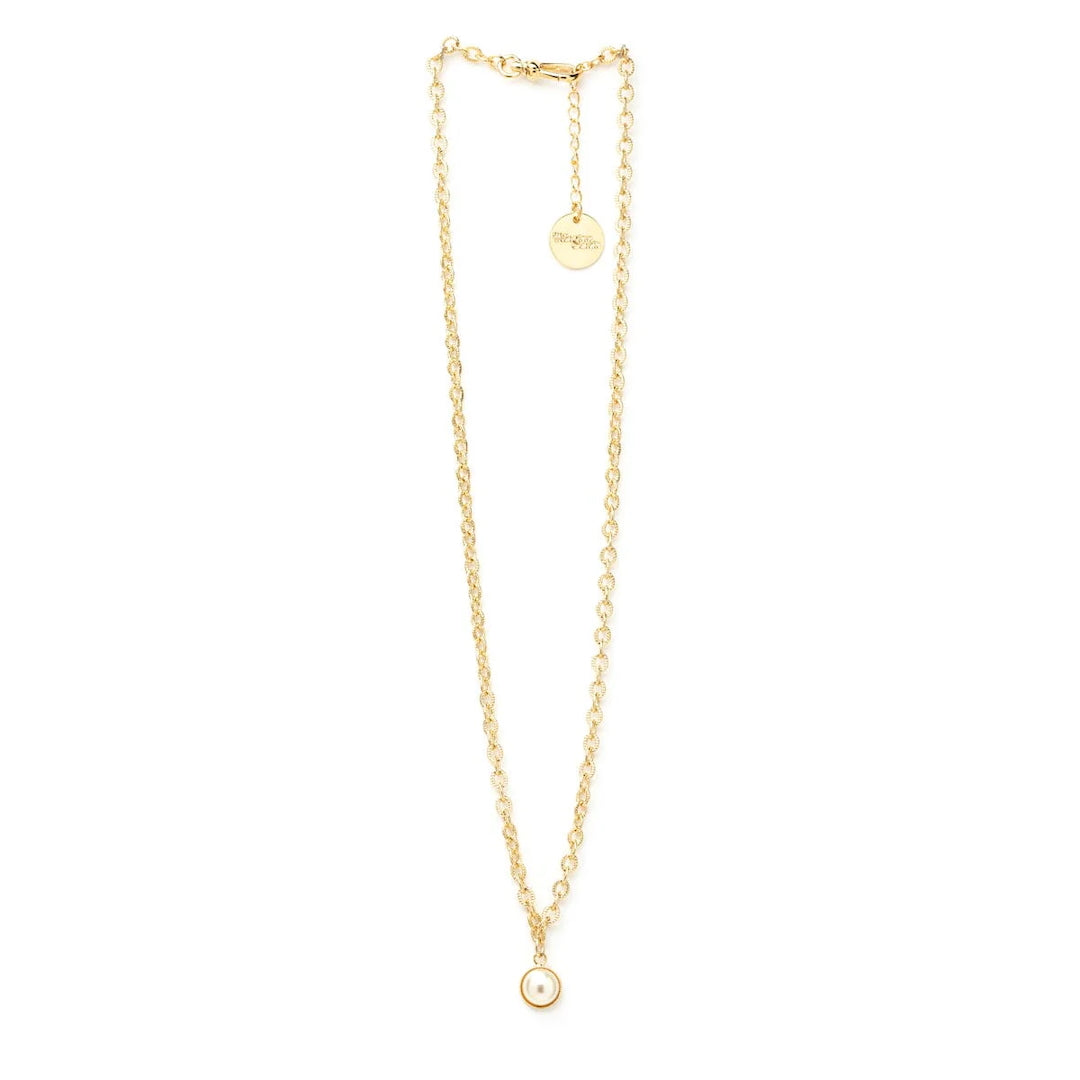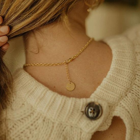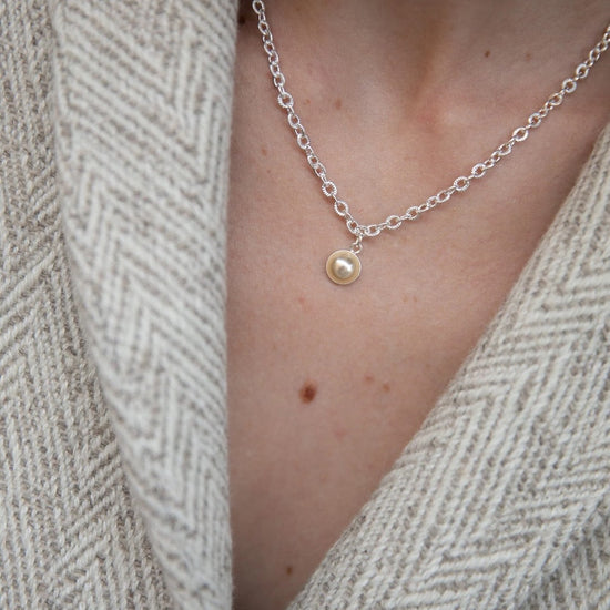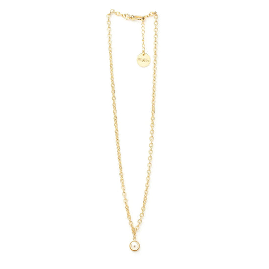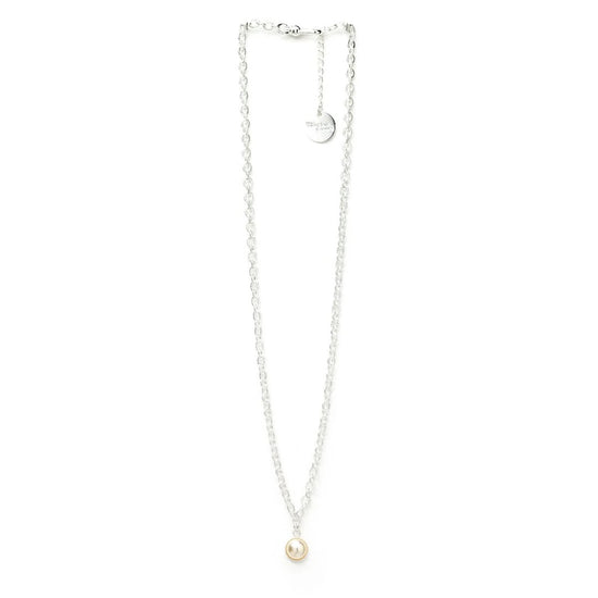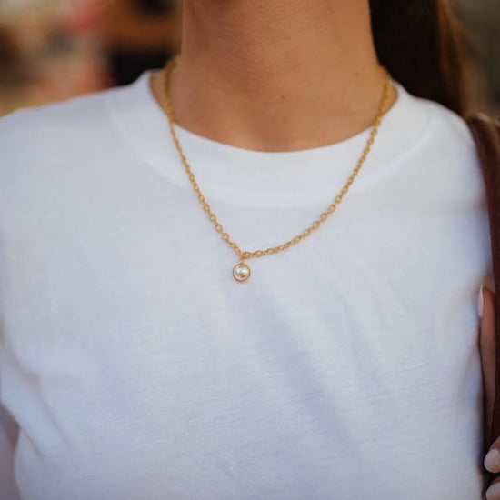 In recycled and RJC-COC certified 24k gold-plated brass or silver-plated brass with a cable chain - 40 cm - and a cream cabochon bead Ø 1 cm. 3 cm adjustment chain, lobster clasp and medallion engraved with the logo.
