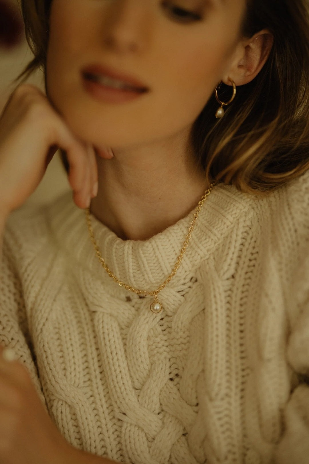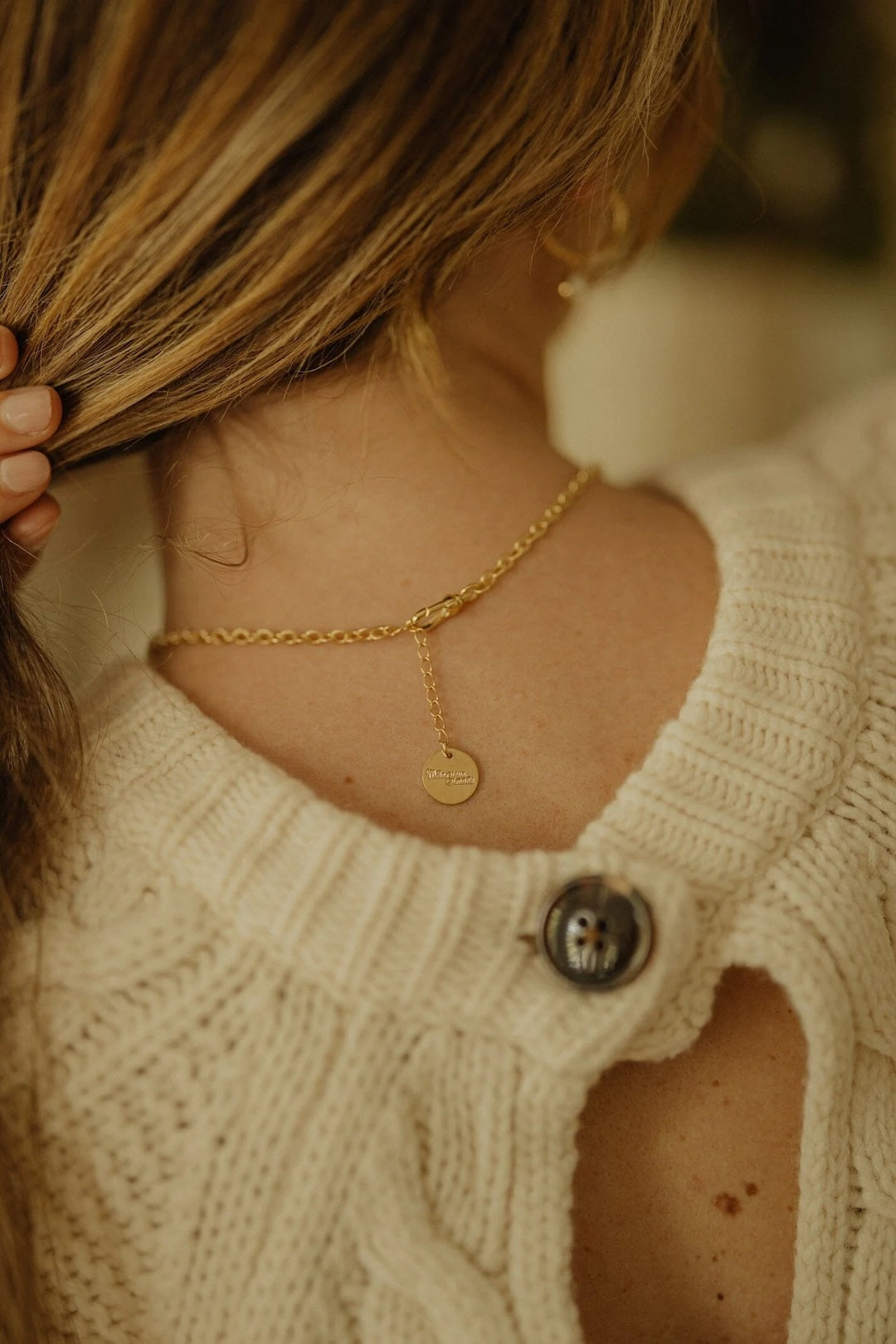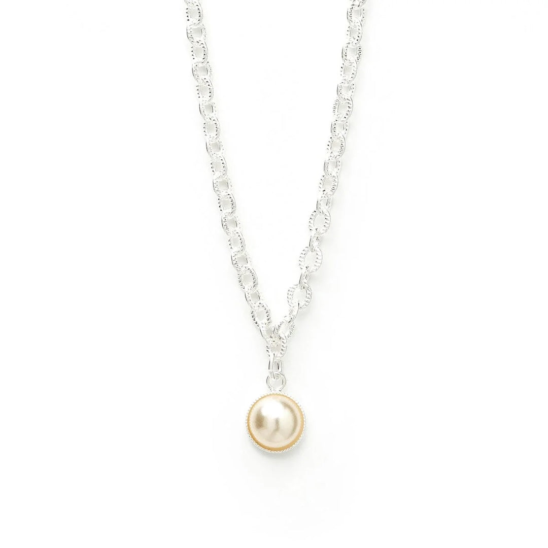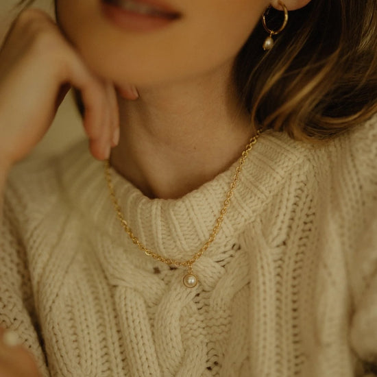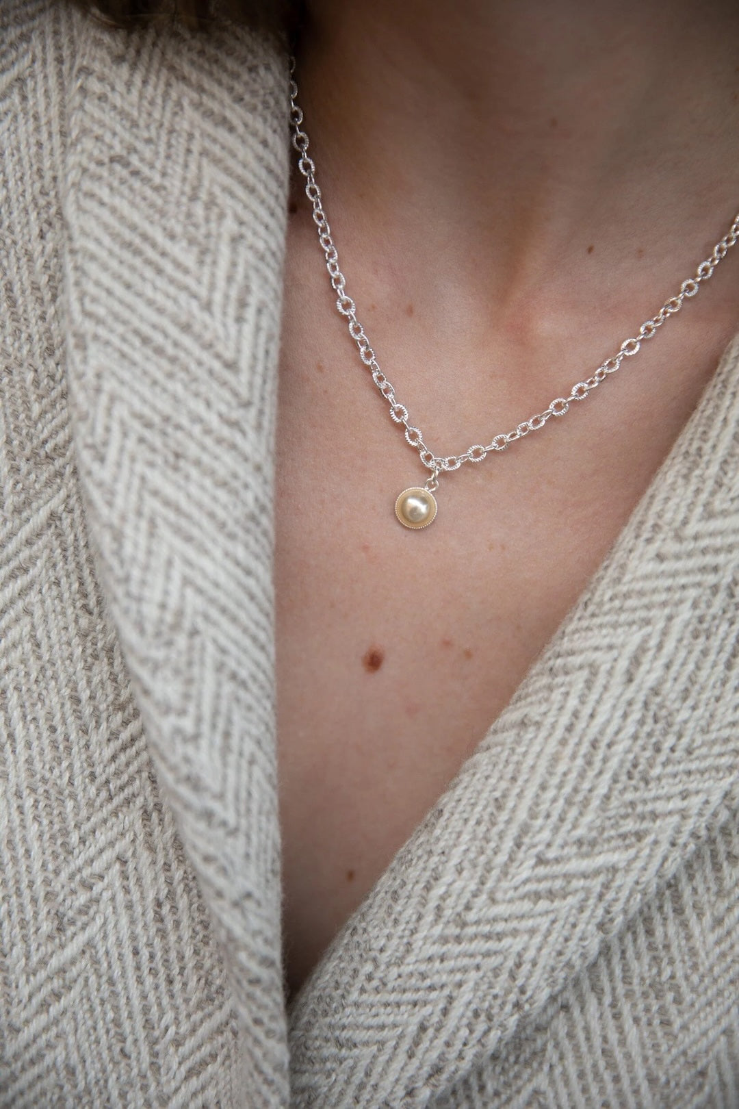 In recycled and RJC-COC certified 24k gold-plated brass or silver-plated brass with a cable chain - 40 cm - and a cream cabochon bead Ø 1 cm. 3 cm adjustment chain, lobster clasp and medallion engraved with the logo.