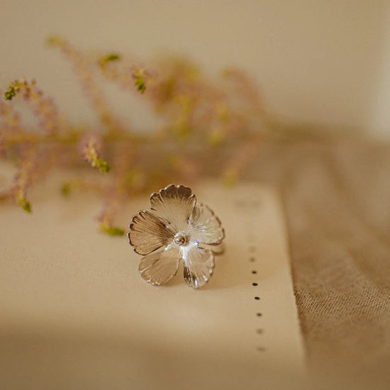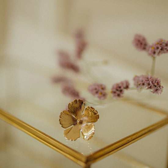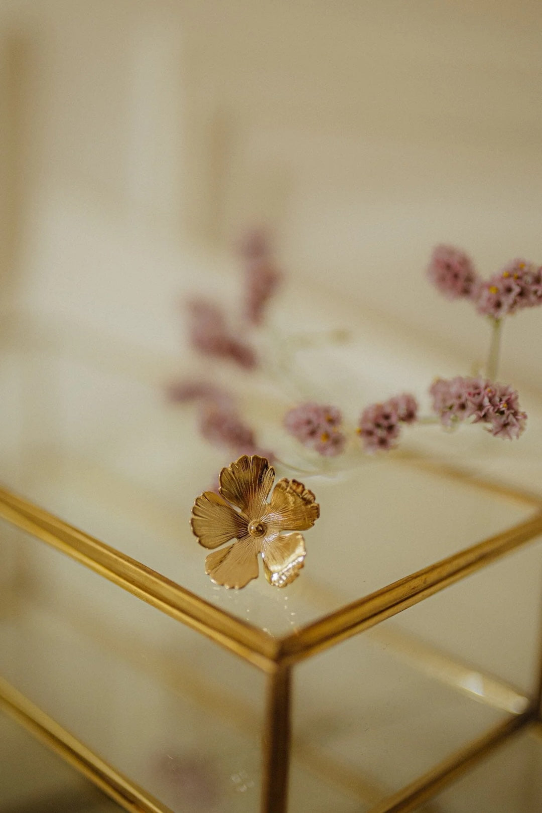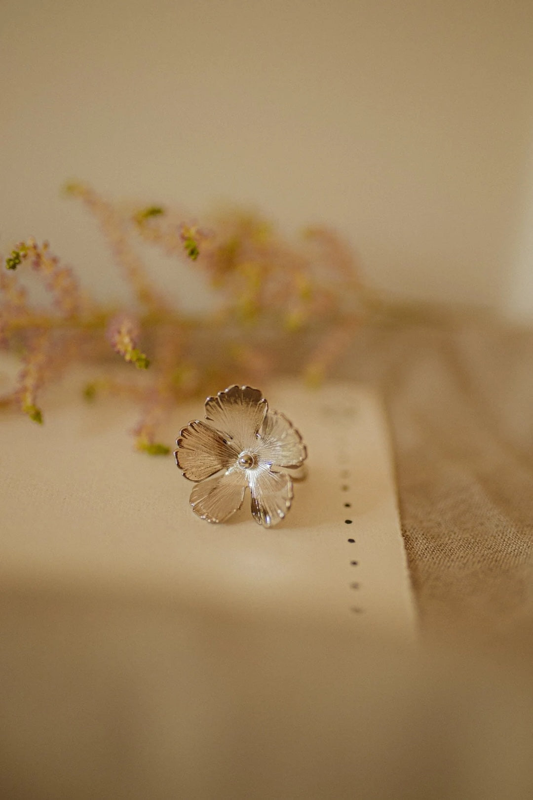 Ø 3 cm - in recycled and RJC-COC certified 24k gold-plated brass or silver plated brass with a flower or silver-plated brass with a flower.