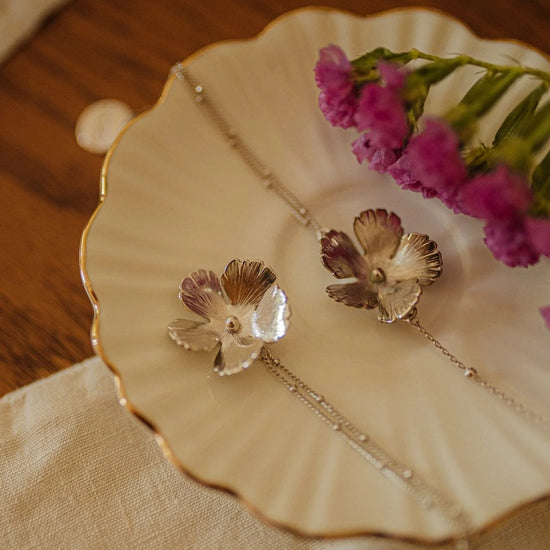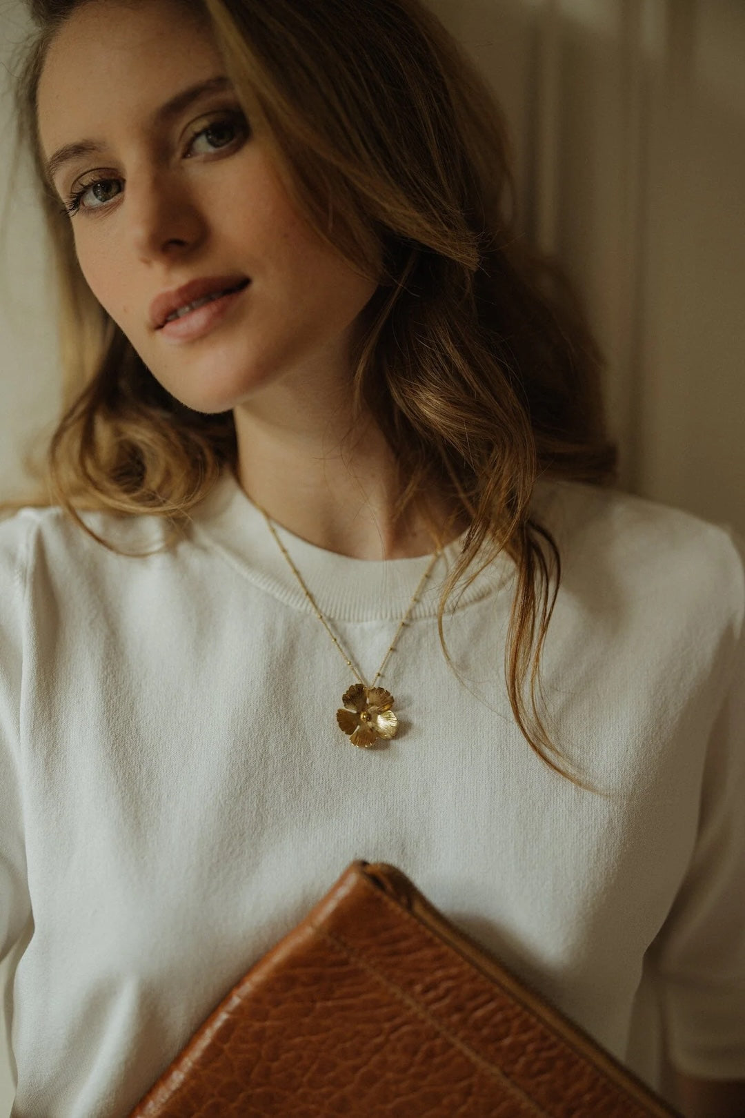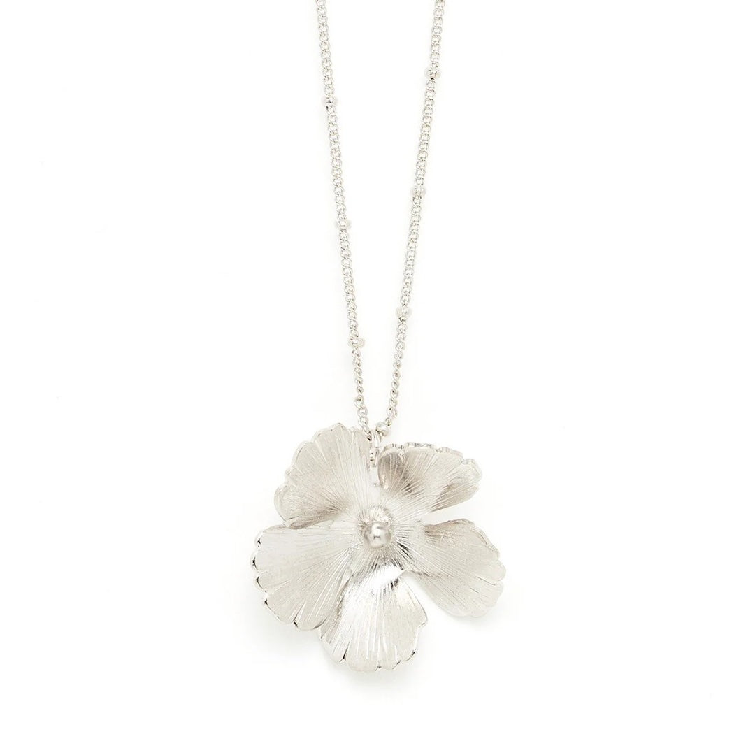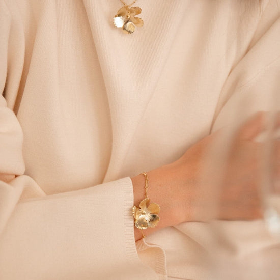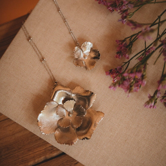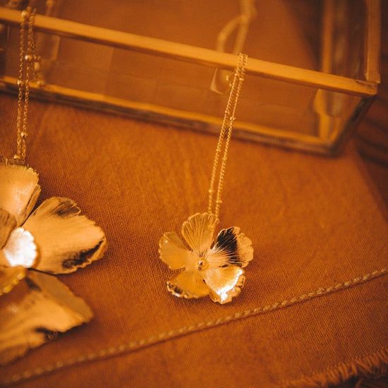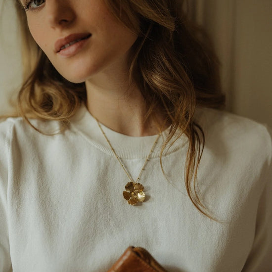 In recycled and RJC-COC certified 24k fine gold plated brass or silver plated brass with a ball chain - 40 cm - and a hollow flower. 3 cm adjustment chain, lobster clasp and medallion engraved with the logo.