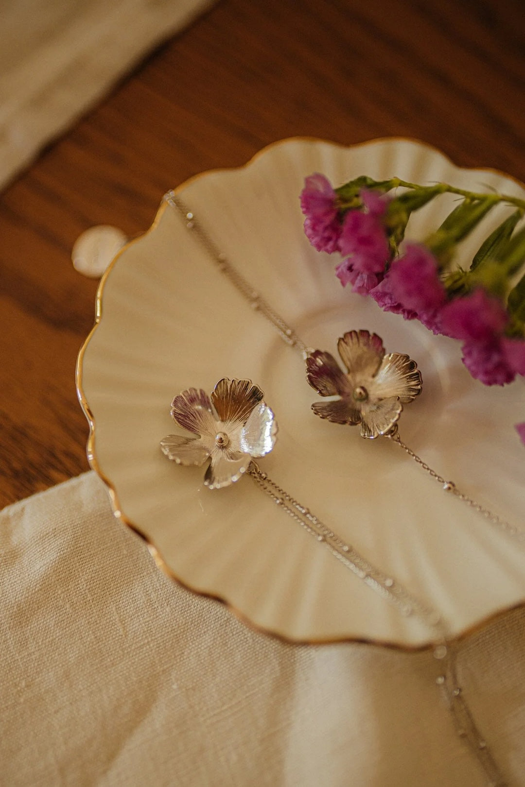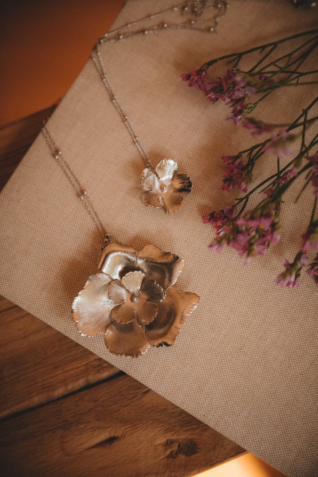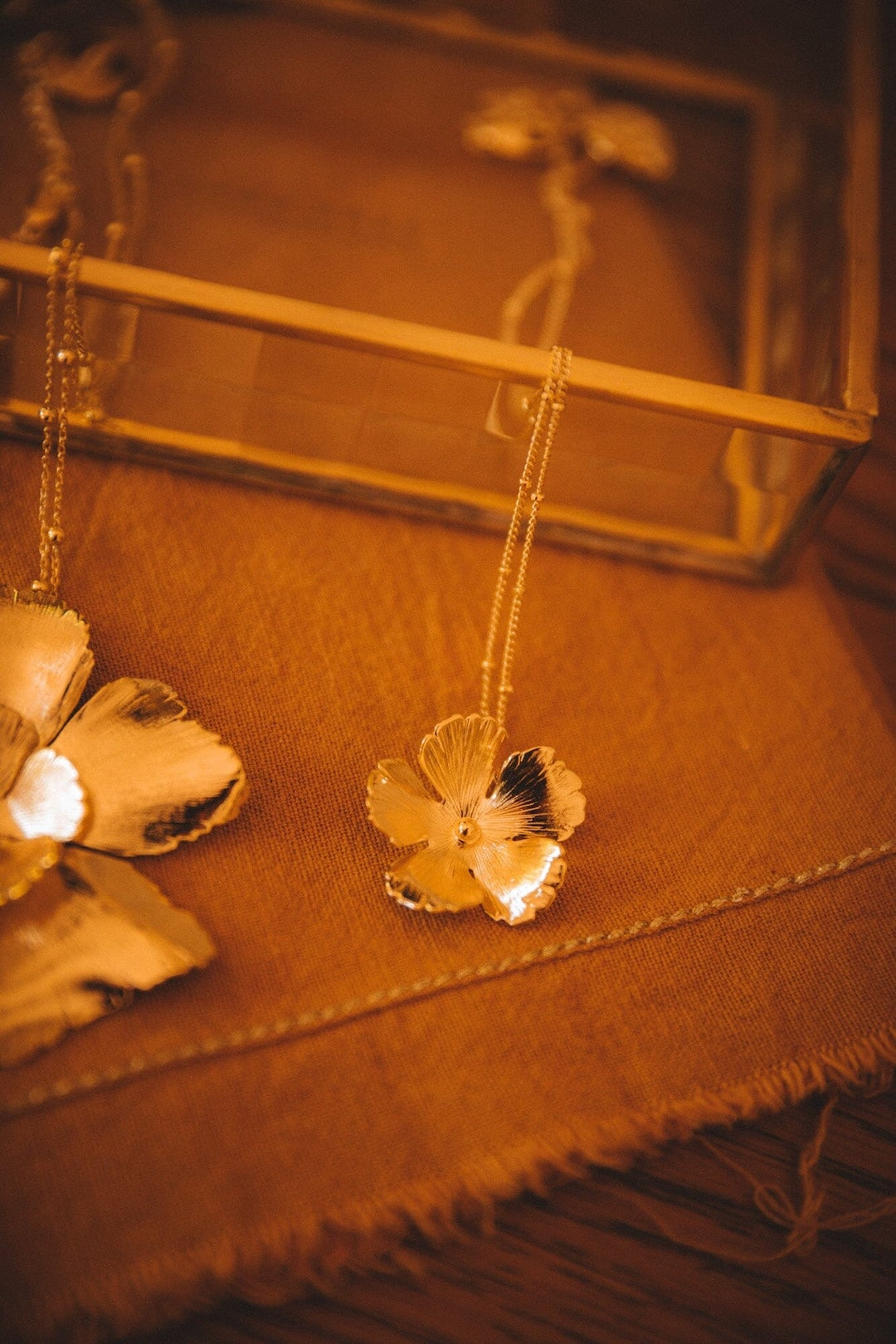 In recycled and RJC-COC certified 24k fine gold plated brass or silver plated brass with a ball chain - 40 cm - and a hollow flower. 3 cm adjustment chain, lobster clasp and medallion engraved with the logo.