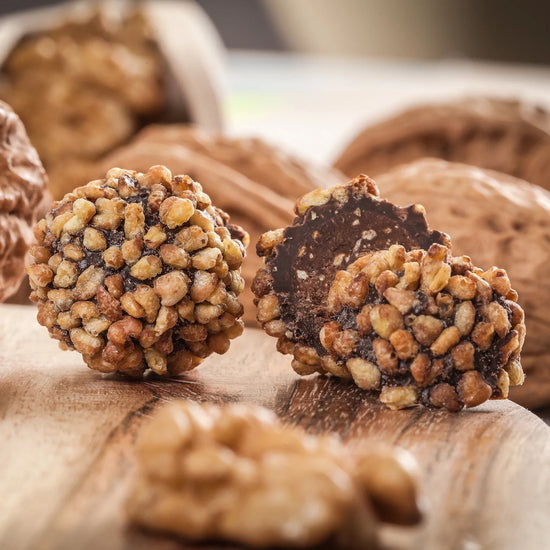 Crock'Noix du Quercy cacao poudré :The Quercy walnut kernel has an Appellation d'Origine Contrôlée. It is caramelized to give it all its crunch, then coated with powdered cocoa chocolate. A rare delicacy made in the Périgord, which can accompany your coffee or tea.