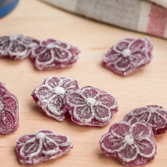 Violette: Flower or candy? Your taste buds will immediately be seduced by our baked candy with natural flavoring. Its sweet scent of violets, a flower native to Toulouse, will take you back to your childhood memories.