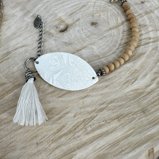 The wrist is adorned with a string of natural wooden pearls, accented with a white pompom for a hint of sweetness and originality. The combination of materials balances elegance with a playful, modern flair.