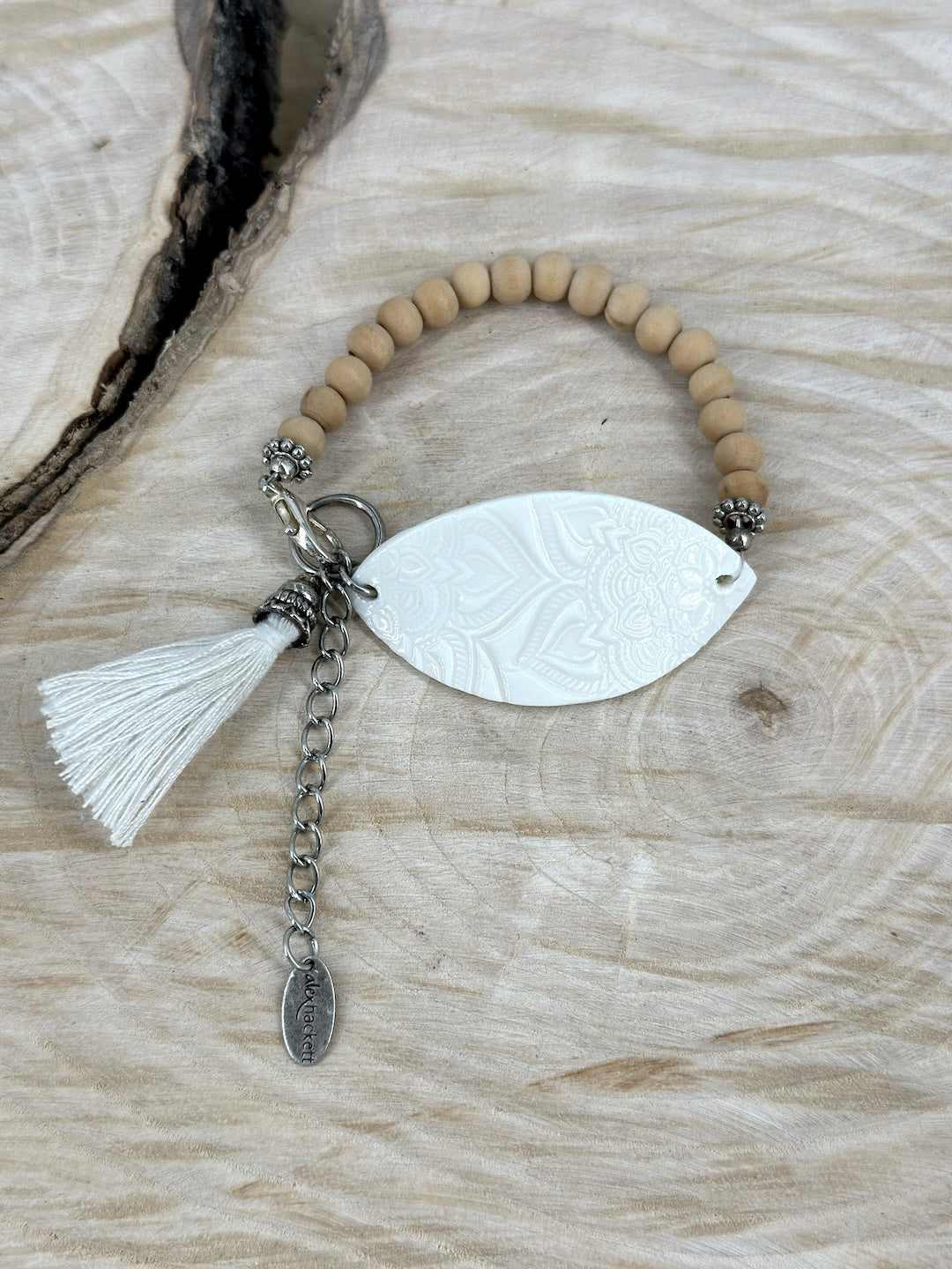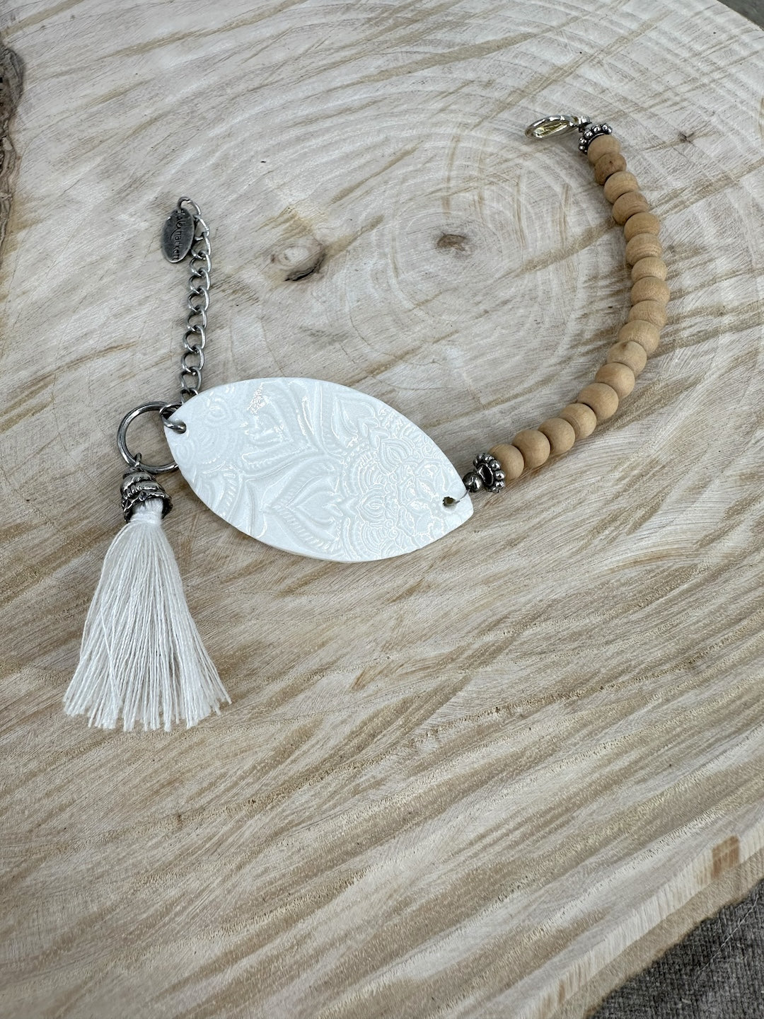 The leaf medallion is delicately decorated with an Arabesque pattern, showcasing Alex Hackett’s meticulous craftsmanship and adding a subtle touch of sophistication. Each medallion is individually handcrafted, making every bracelet a unique work of art.