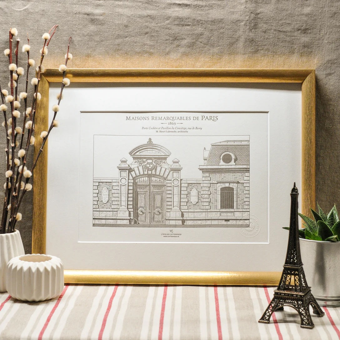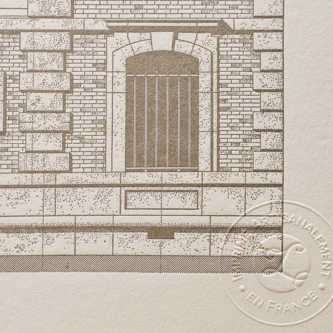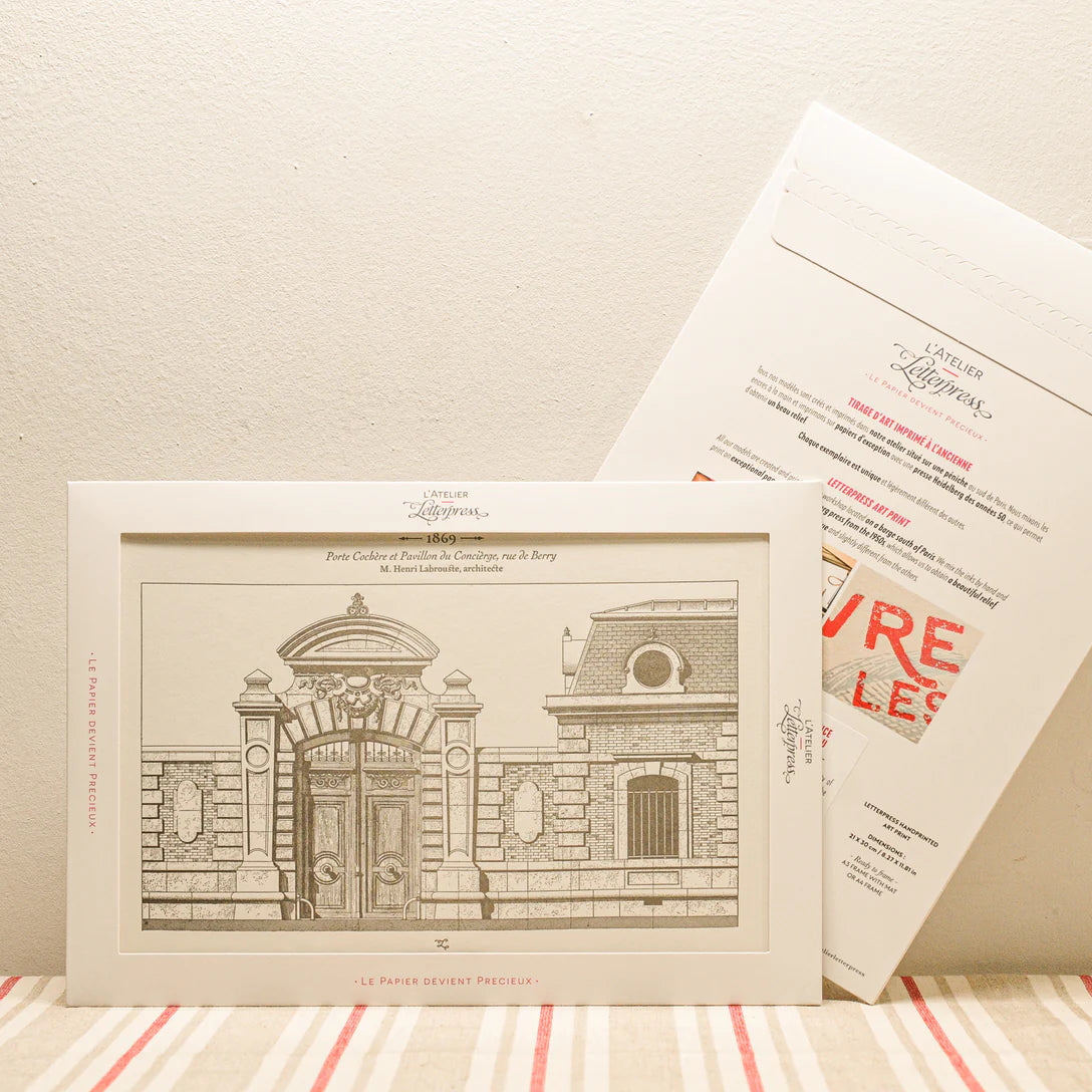 Printed with the traditional Letterpress technique, every detail of the monumental carriage door is brought to life with depth and texture. The relief effect created by the press interacts beautifully with light, giving the piece a tactile and sculptural dimension. The use of luxurious 100% cotton paper ensures durability while enhancing the timeless aesthetic of this collectible artwork.