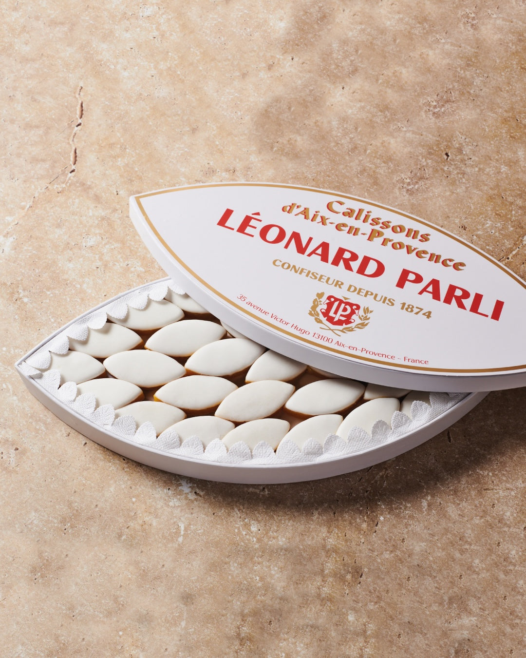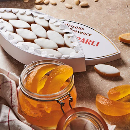 For over a century, Léonard Parli has remained faithful to its traditional methods, making each Calisson a true work of art. Our recipe is distinguished by a remarkably high almond content, combined with the finest candied fruits. Ground under historic granite rollers, the ingredients blend slowly to preserve both texture and flavor, guaranteeing an authentic Provençal experience.
