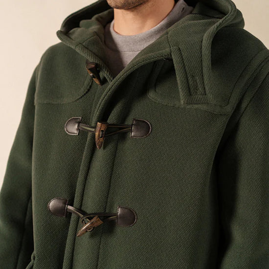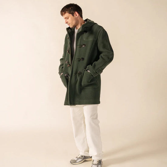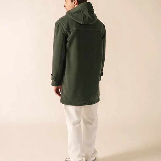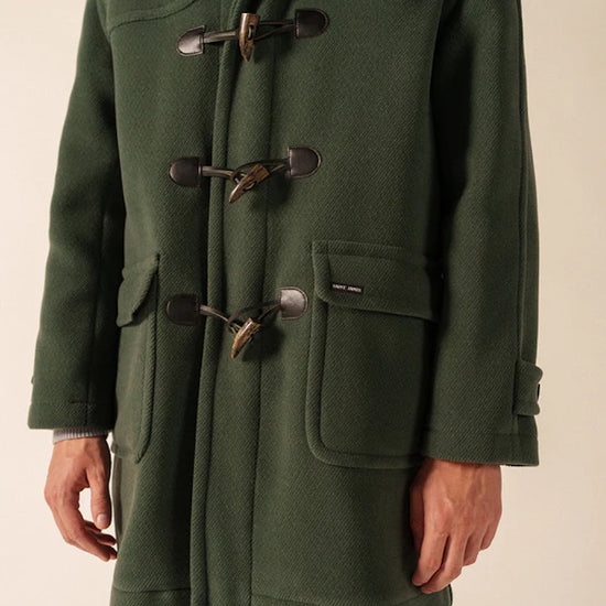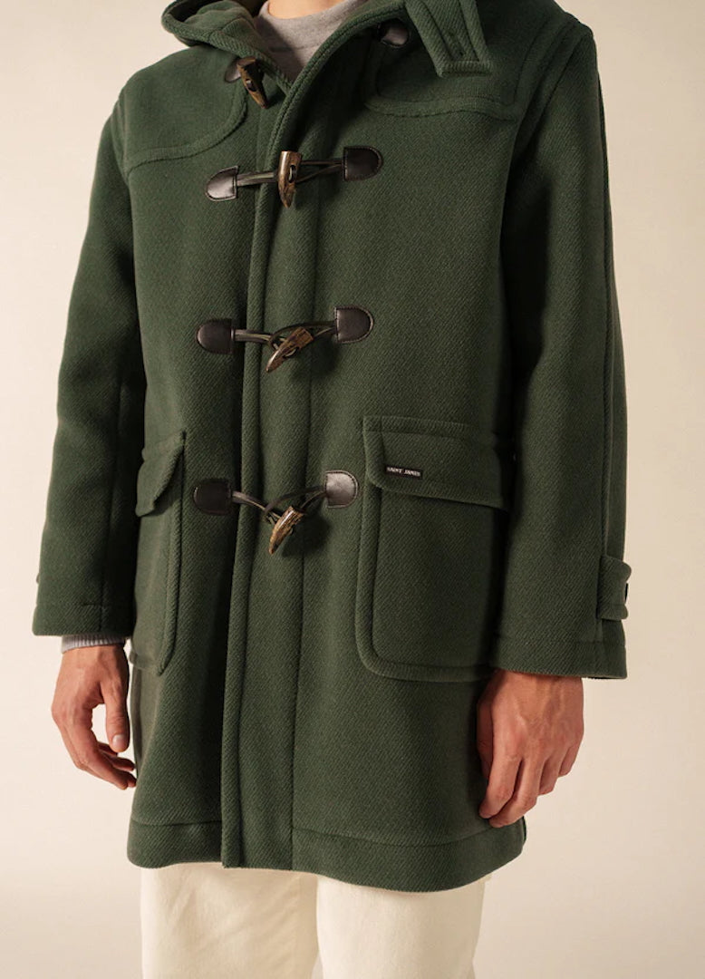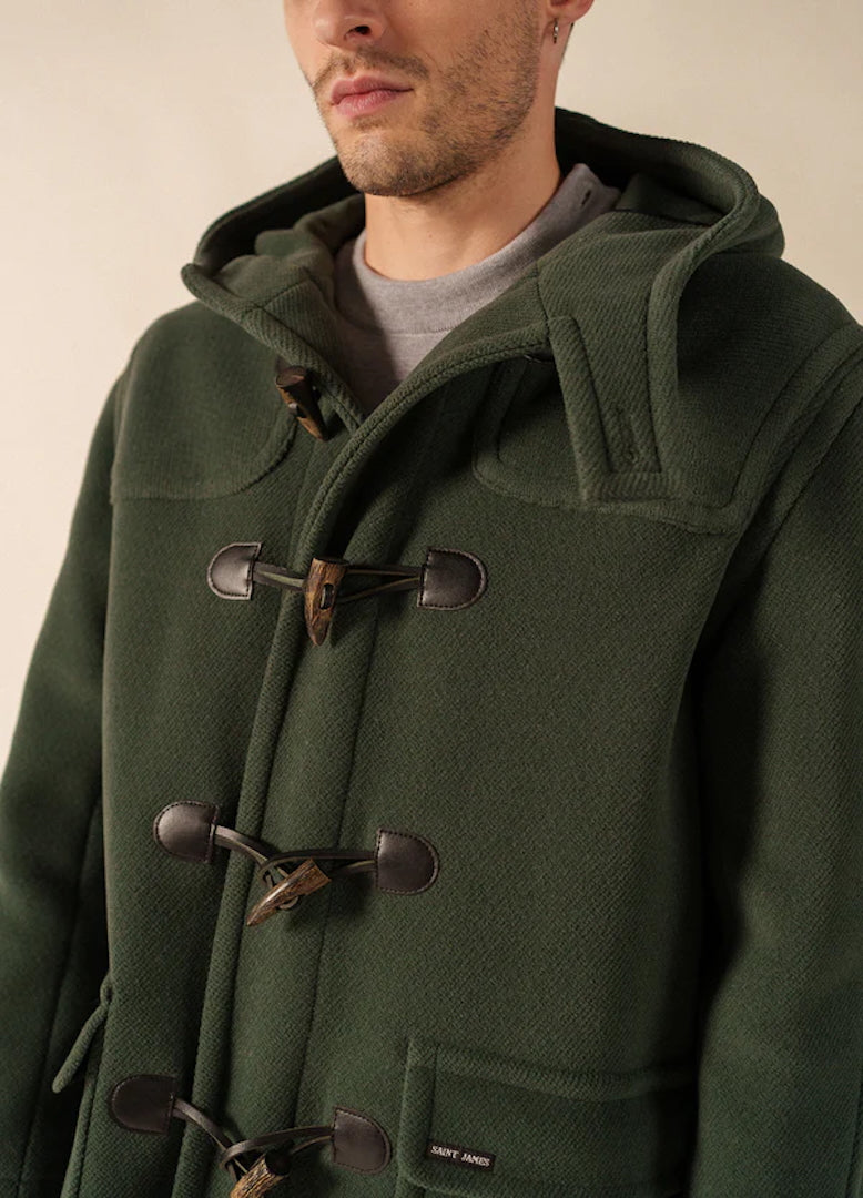The Vegetal Saturne Duffle-Coat brings a fresh, natural take to a classic design. Its earthy green tone adds a contemporary edge to a heritage-inspired silhouette. Applique detailing on the upper body accentuates the craftsmanship, while the zip fastening with horn and leather toggles offers both secure closure and traditional character.