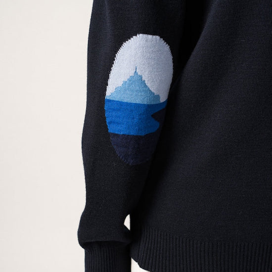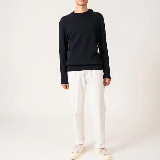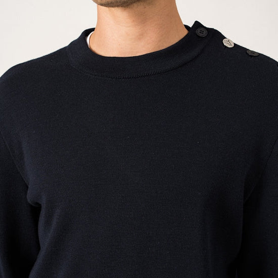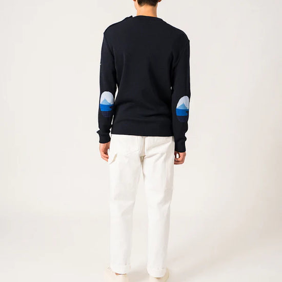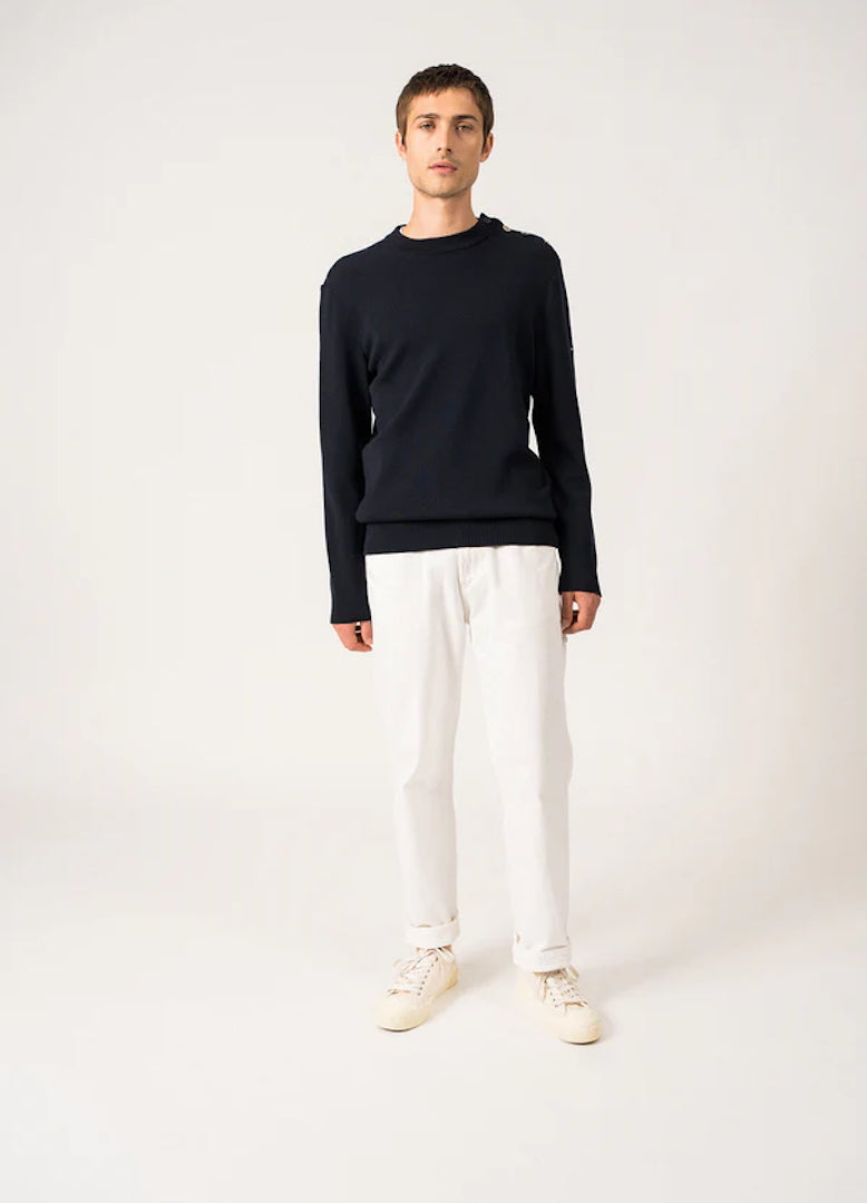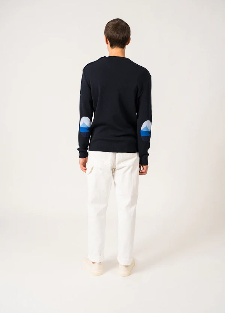 The Mondiovision Epic Jumper is knitted in these workshops, just a few kilometers from the Mont itself. This classic sailor’s wool jumper features a shoulder button placket and a re-stitched round neckline— hallmark details of our century-old maritime designs. Knitted in a finer gauge than our traditional Matelot sweater, it offers a softer, lighter feel while the ribbed hem enhances both volume and comfort. The sleeves feature an elegant motif of the Mont, knitted directly into the fabric, celebrating this exclusive collaboration.